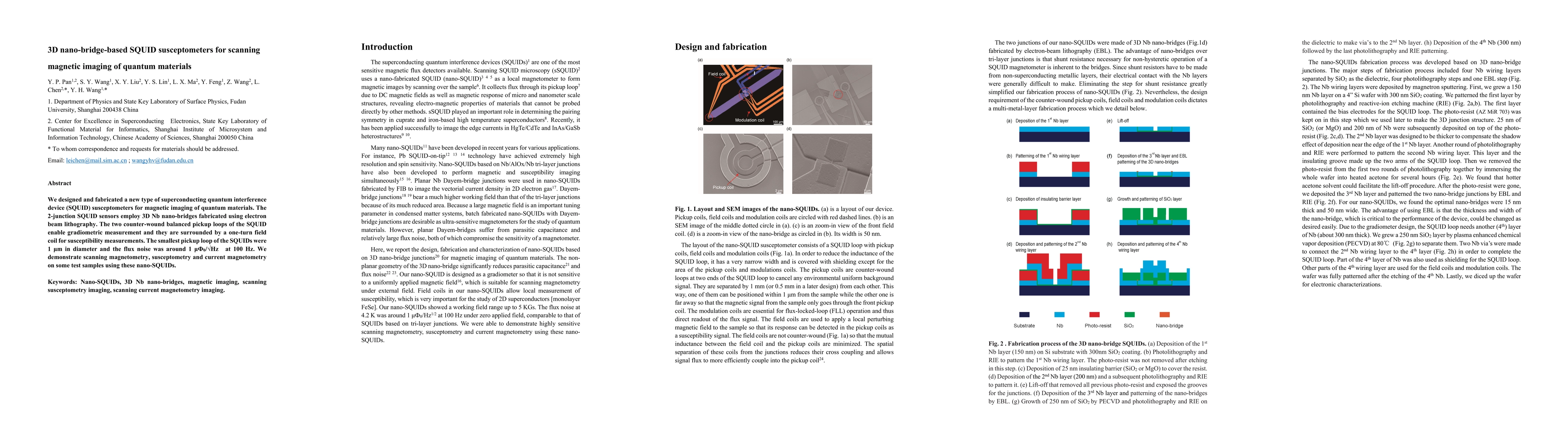 This paper details the design and fabrication of a novel 3D nano-bridge-based SQUID susceptometer for magnetic imaging of quantum materials, employing 2-junction SQUID sensors with Nb nano-bridges. The device demonstrates high sensitivity with a flux noise of 1 μΦ₀/√Hz at 100 Hz and enables gradiometric measurements for scanning magnetometry and susceptometry.