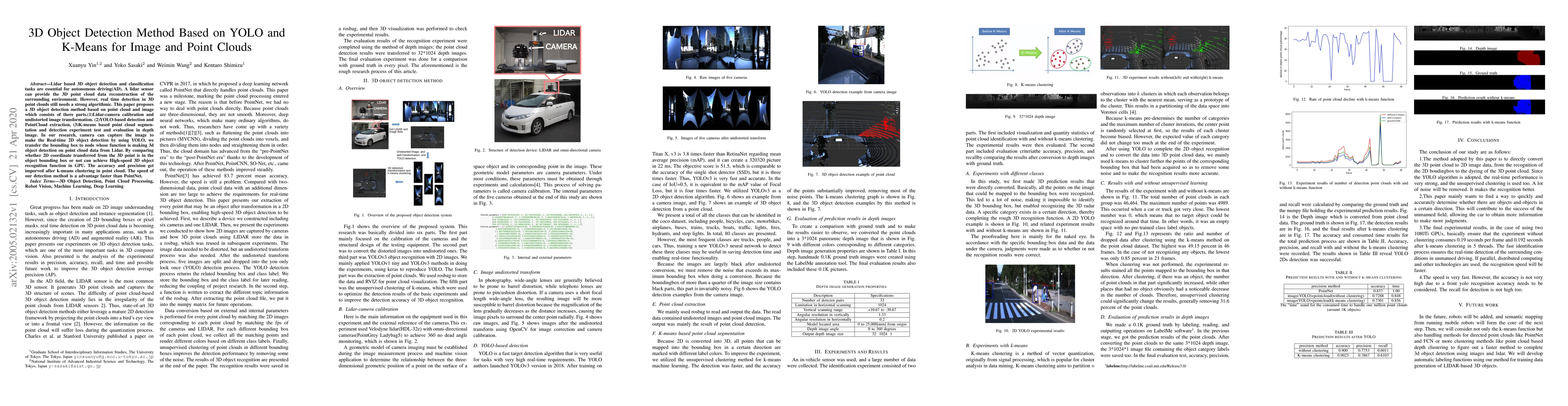 This paper presents a 3D object detection method combining YOLO for real-time 2D detection and K-means for point cloud segmentation, utilizing both image and Lidar point cloud data. The method enhances accuracy and speed, outperforming PointNet in detection speed.