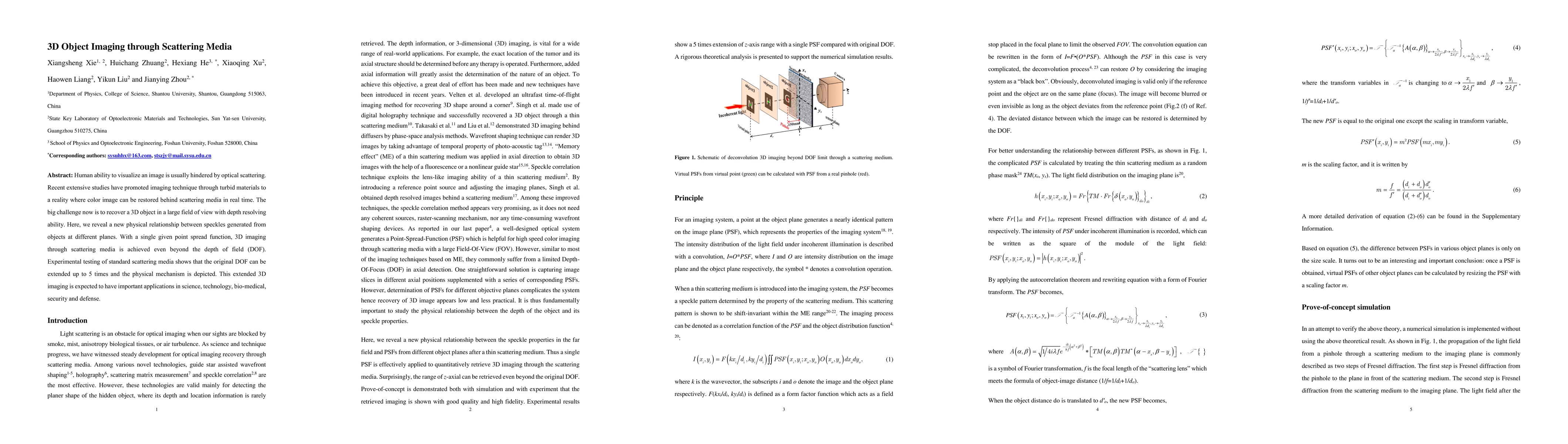 This paper presents a novel technique for 3D imaging through scattering media, extending the depth of field up to five times beyond conventional limits. By uncovering a new physical relationship between speckles from different object planes, the method enables real-time 3D imaging even beyond the depth of field, with potential applications in various fields including bio-medical and defense.