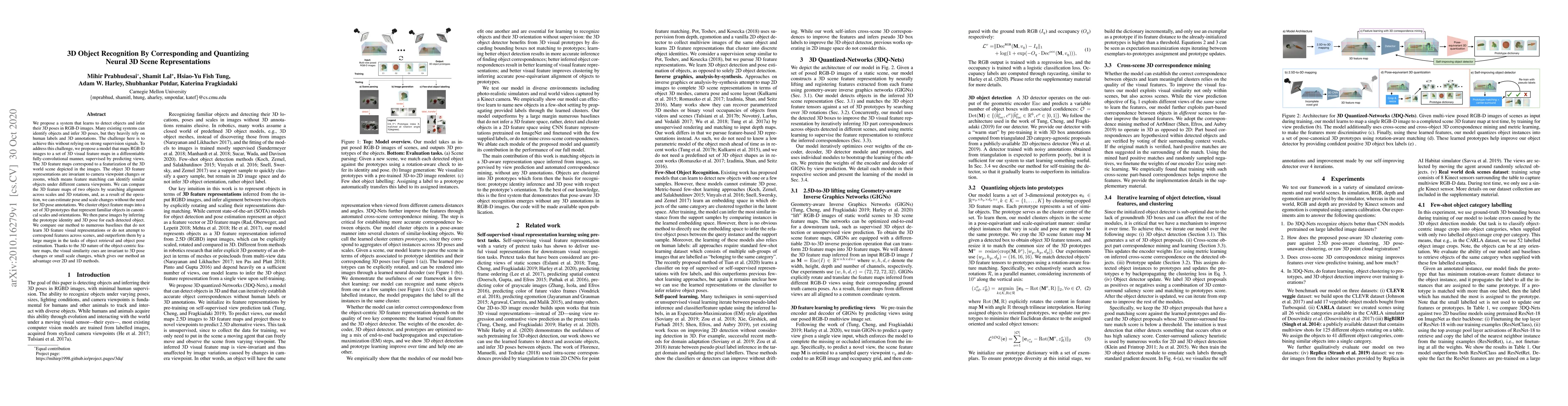 We propose a system that learns to detect objects and infer their 3D poses in RGB-D images. Many existing systems can identify objects and infer 3D poses, but they heavily rely on human labels and 3D annotations. The challenge here is to achieve this without relying on strong supervision signals. To address this challenge, we propose a model that maps RGB-D images to a set of 3D visual feature maps in a differentiable fully-convolutional manner, supervised by predicting views. The 3D feature maps correspond to a featurization of the 3D world scene depicted in the images. The object 3D feature representations are invariant to camera viewpoint changes or zooms, which means feature matching can identify similar objects under different camera viewpoints. We can compare the 3D feature maps of two objects by searching alignment across scales and 3D rotations, and, as a result of the operation, we can estimate pose and scale changes without the need for 3D pose annotations. We cluster object feature maps into a set of 3D prototypes that represent familiar objects in canonical scales and orientations. We then parse images by inferring the prototype identity and 3D pose for each detected object. We compare our method to numerous baselines that do not learn 3D feature visual representations or do not attempt to correspond features across scenes, and outperform them by a large margin in the tasks of object retrieval and object pose estimation. Thanks to the 3D nature of the object-centric feature maps, the visual similarity cues are invariant to 3D pose changes or small scale changes, which gives our method an advantage over 2D and 1D methods.