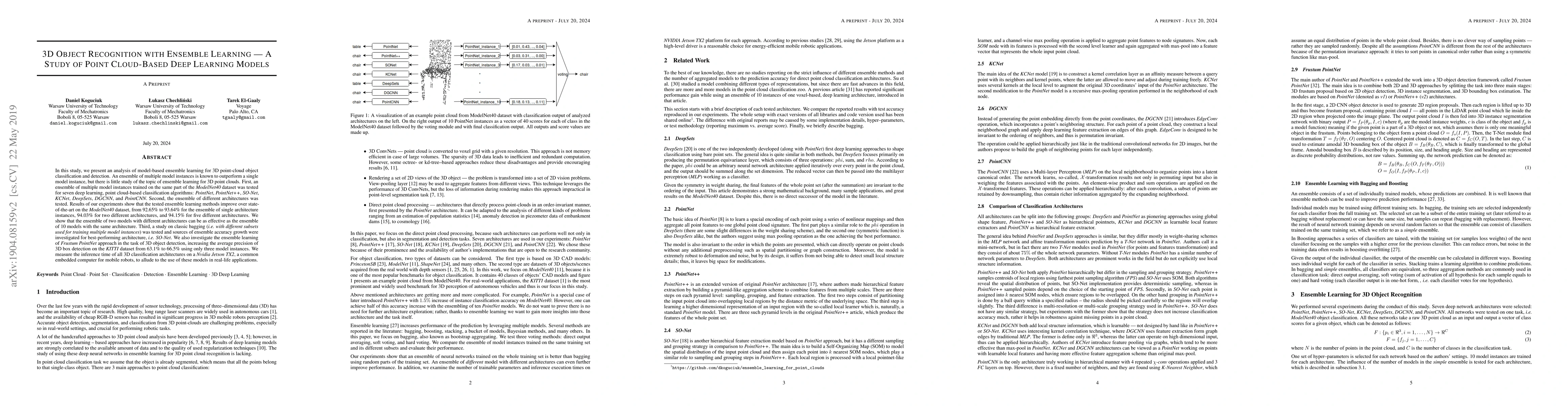 In this study, we present an analysis of model-based ensemble learning for 3D point-cloud object classification and detection. An ensemble of multiple model instances is known to outperform a single model instance, but there is little study of the topic of ensemble learning for 3D point clouds. First, an ensemble of multiple model instances trained on the same part of the $\textit{ModelNet40}$ dataset was tested for seven deep learning, point cloud-based classification algorithms: $\textit{PointNet}$, $\textit{PointNet++}$, $\textit{SO-Net}$, $\textit{KCNet}$, $\textit{DeepSets}$, $\textit{DGCNN}$, and $\textit{PointCNN}$. Second, the ensemble of different architectures was tested. Results of our experiments show that the tested ensemble learning methods improve over state-of-the-art on the $\textit{ModelNet40}$ dataset, from $92.65\%$ to $93.64\%$ for the ensemble of single architecture instances, $94.03\%$ for two different architectures, and $94.15\%$ for five different architectures. We show that the ensemble of two models with different architectures can be as effective as the ensemble of 10 models with the same architecture. Third, a study on classic bagging i.e. with different subsets used for training multiple model instances) was tested and sources of ensemble accuracy growth were investigated for best-performing architecture, i.e. $\textit{SO-Net}$. We also investigate the ensemble learning of $\textit{Frustum PointNet}$ approach in the task of 3D object detection, increasing the average precision of 3D box detection on the $\textit{KITTI}$ dataset from $63.1\%$ to $66.5\%$ using only three model instances. We measure the inference time of all 3D classification architectures on a $\textit{Nvidia Jetson TX2}$, a common embedded computer for mobile robots, to allude to the use of these models in real-life applications.