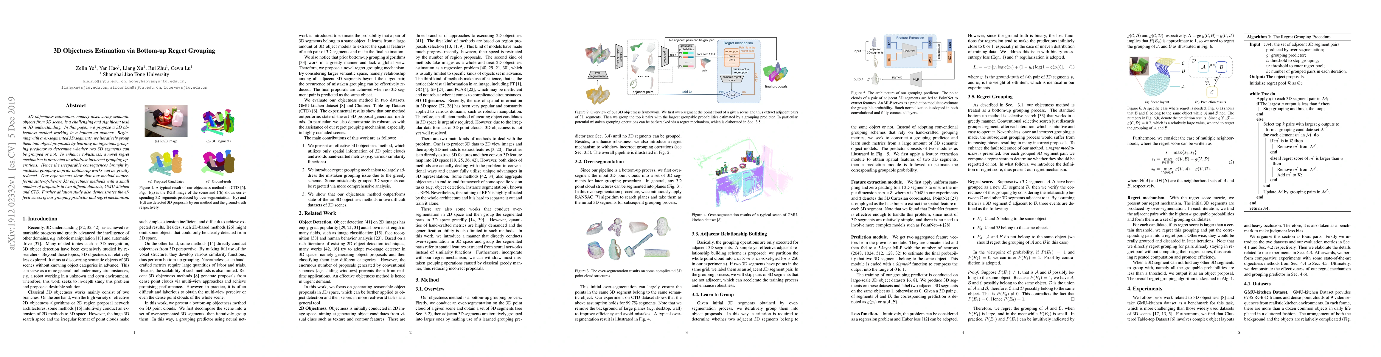 This paper proposes a bottom-up method for 3D objectness estimation that iteratively groups over-segmented 3D segments into object proposals using a learned grouping predictor. A novel regret mechanism is introduced to correct incorrect groupings, enhancing robustness and outperforming state-of-the-art methods on two challenging datasets.