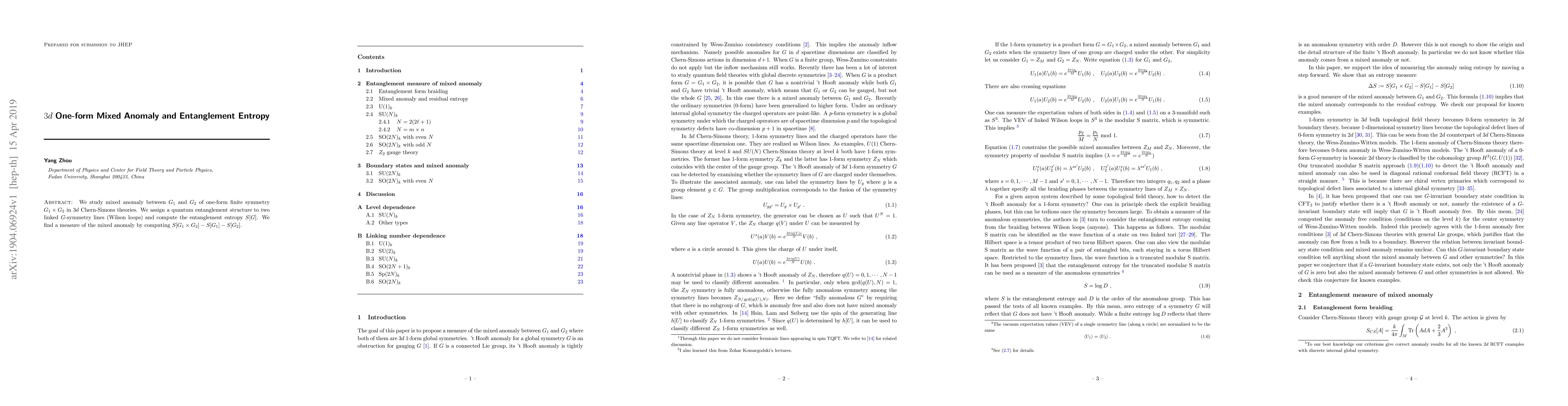 This paper investigates the mixed anomaly between $G_1$ and $G_2$ in $3d$ Chern-Simons theories, linking it to entanglement entropy between two linked symmetry lines. The study reveals a measure of the mixed anomaly through the entanglement entropy difference $S[G_1\times G_2]-S[G_1]-S[G_2]$.