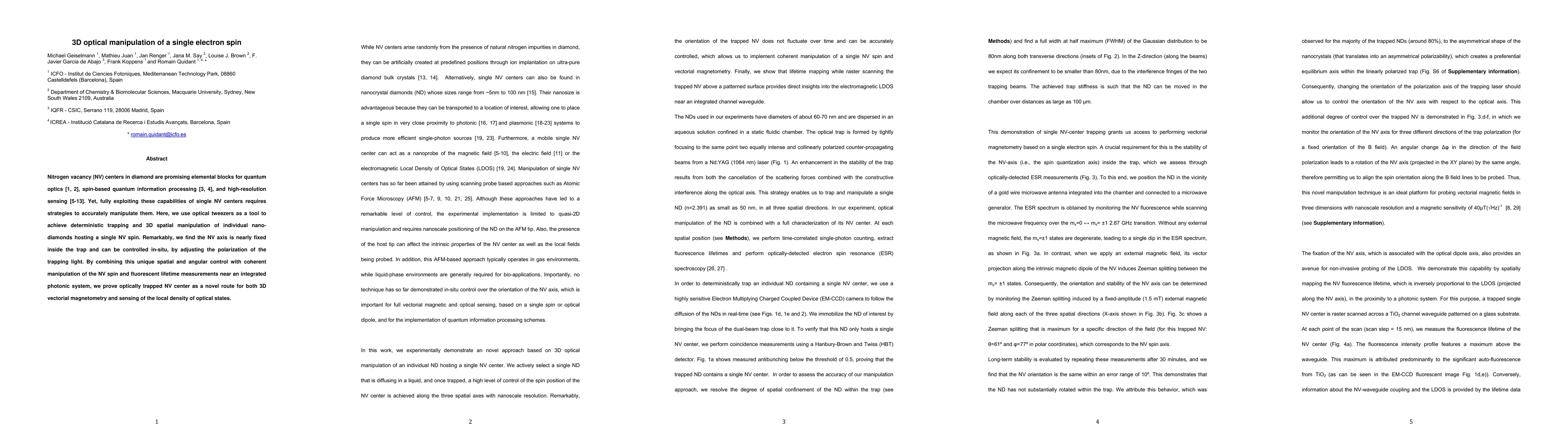 Nitrogen vacancy (NV) centers in diamond are promising elemental blocks for quantum optics [1, 2], spin-based quantum information processing [3, 4], and high-resolution sensing [5-13]. Yet, fully exploiting these capabilities of single NV centers requires strategies to accurately manipulate them. Here, we use optical tweezers as a tool to achieve deterministic trapping and 3D spatial manipulation of individual nano-diamonds hosting a single NV spin. Remarkably, we find the NV axis is nearly fixed inside the trap and can be controlled in-situ, by adjusting the polarization of the trapping light. By combining this unique spatial and angular control with coherent manipulation of the NV spin and fluorescent lifetime measurements near an integrated photonic system, we prove optically trapped NV center as a novel route for both 3D vectorial magnetometry and sensing of the local density of optical states.