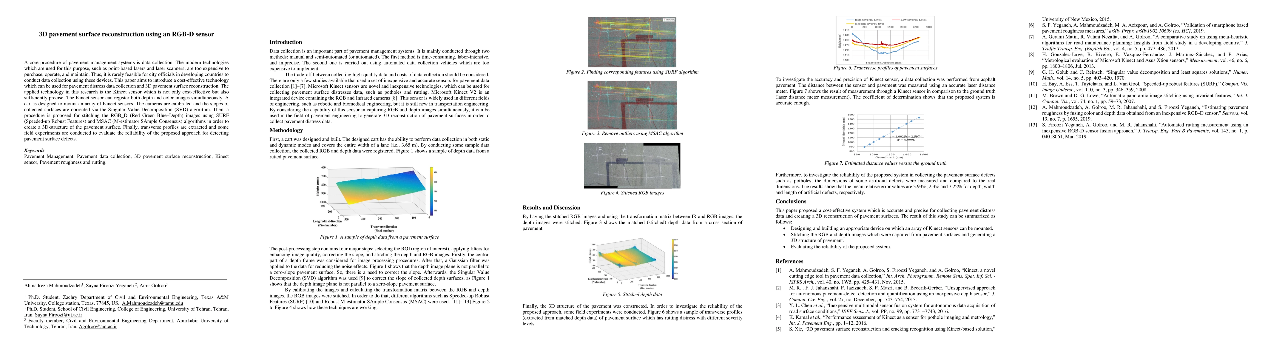 A core procedure of pavement management systems is data collection. The modern technologies which are used for this purpose, such as point-based lasers and laser scanners, are too expensive to purchase, operate, and maintain. Thus, it is rarely feasible for city officials in developing countries to conduct data collection using these devices. This paper aims to introduce a cost-effective technology which can be used for pavement distress data collection and 3D pavement surface reconstruction. The applied technology in this research is the Kinect sensor which is not only cost-effective but also sufficiently precise. The Kinect sensor can register both depth and color images simultaneously. A cart is designed to mount an array of Kinect sensors. The cameras are calibrated and the slopes of collected surfaces are corrected via the Singular Value Decomposition (SVD) algorithm. Then, a procedure is proposed for stitching the RGB-D (Red Green Blue Depth) images using SURF (Speeded-up Robust Features) and MSAC (M-estimator SAmple Consensus) algorithms in order to create a 3D-structure of the pavement surface. Finally, transverse profiles are extracted and some field experiments are conducted to evaluate the reliability of the proposed approach for detecting pavement surface defects.