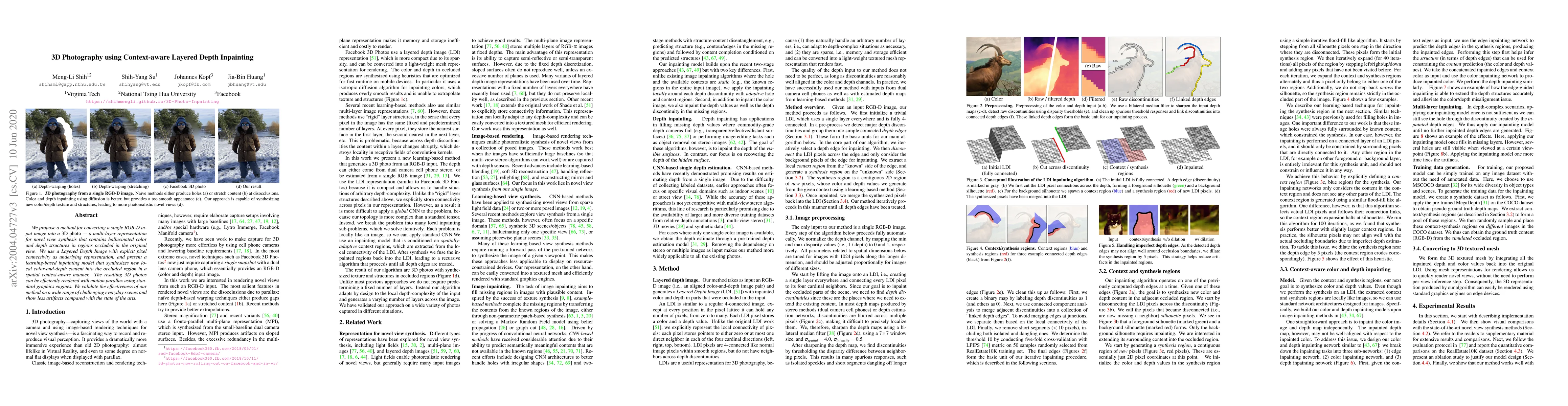 The paper proposes a method for converting a single RGB-D input image into a 3D photo using context-aware layered depth inpainting. It employs a Layered Depth Image with explicit pixel connectivity as the underlying representation and presents a learning-based inpainting model that synthesizes new local color-and-depth content into occluded regions in a spatially context-aware manner.