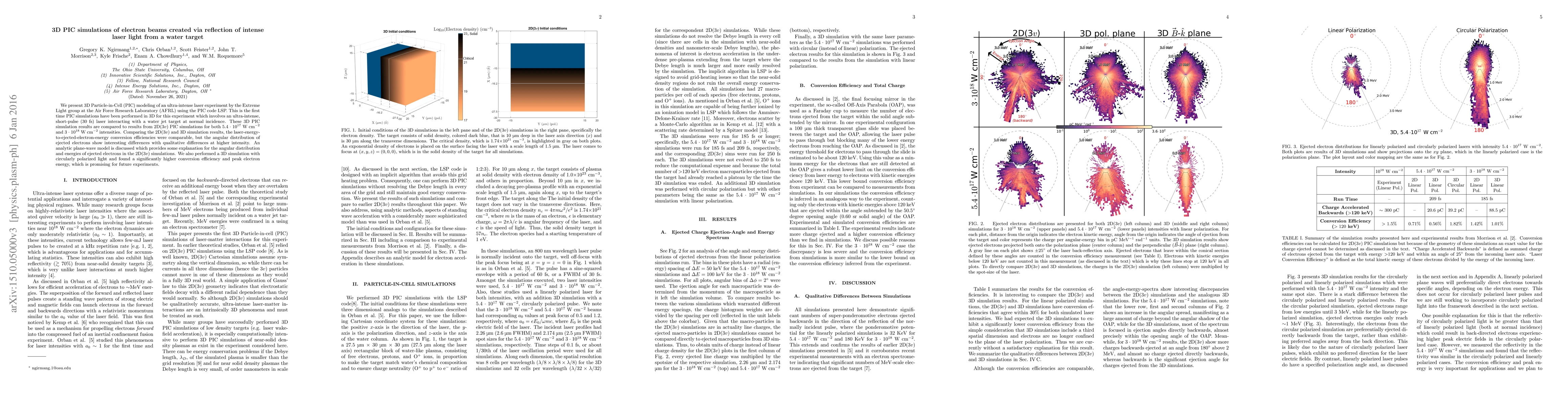 We present 3D Particle-in-Cell (PIC) modeling of an ultra-intense laser experiment by the Extreme Light group at the Air Force Research Laboratory (AFRL) using the PIC code LSP. This is the first time PIC simulations have been performed in 3D for this experiment which involves an ultra-intense, short-pulse (30 fs) laser interacting with a water jet target at normal incidence. These 3D PIC simulation results are compared to results from 2D(3$v$) PIC simulations for both $5.4~\cdot~10^{17}$ W cm$^{-2}$ and $3~\cdot~10^{17}$ W cm$^{-2}$ intensities. Comparing the 2D(3$v$) and 3D simulation results, the laser-energy-to-ejected-electron-energy conversion efficiencies were comparable, but the angular distribution of ejected electrons show interesting differences with qualitative differences at higher intensity. An analytic plane-wave model is discussed which provides some explanation for the angular distribution and energies of ejected electrons in the 2D(3$v$) simulations. We also performed a 3D simulation with circularly polarized light and found a significantly higher conversion efficiency and peak electron energy, which is promising for future experiments.