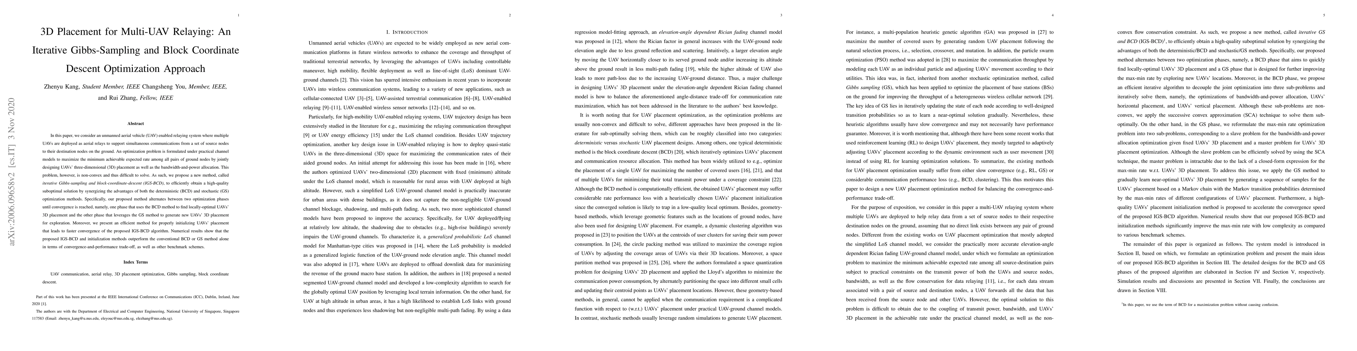 This paper proposes an iterative Gibbs-sampling and block-coordinate-descent (IGS-BCD) optimization approach to determine the 3D placement of multiple UAVs in a relaying system to maximize the minimum achievable rate among ground nodes. The method alternates between BCD for local optimization and GS for exploration, achieving better convergence and performance compared to standalone BCD or GS methods.