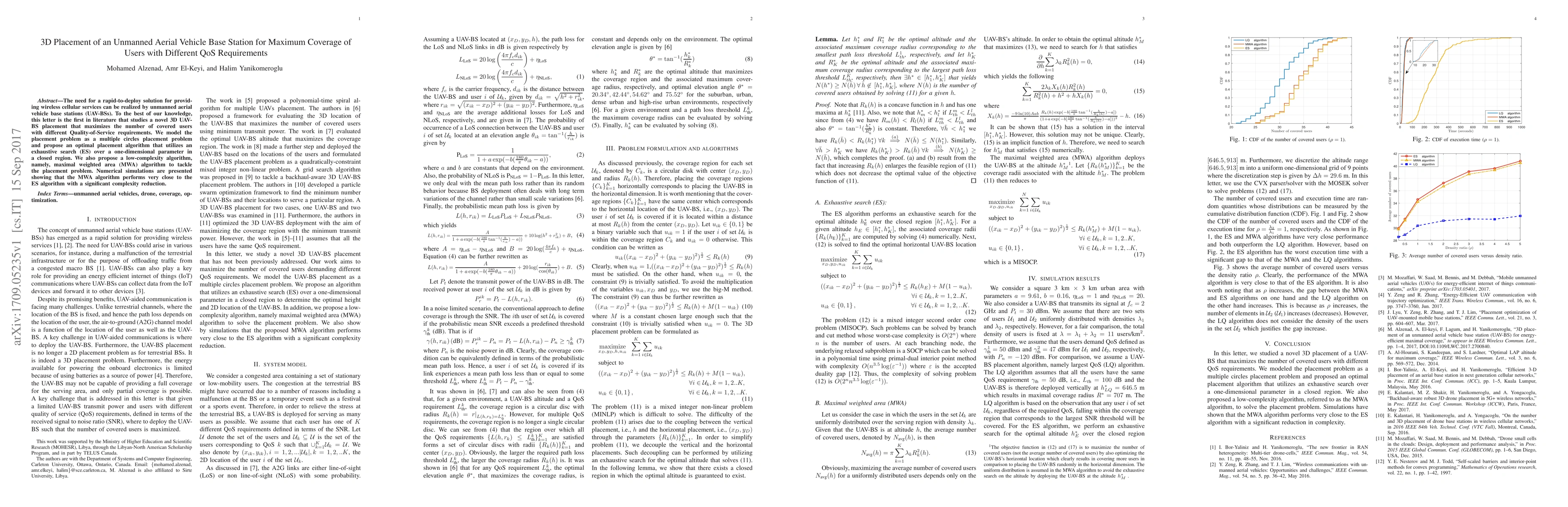 This paper proposes a novel 3D placement algorithm for unmanned aerial vehicle base stations (UAV-BSs) to maximize coverage of users with varying QoS requirements. It introduces an optimal exhaustive search algorithm and a low-complexity maximal weighted area (MWA) algorithm, demonstrating that MWA achieves near-optimal performance with reduced complexity.