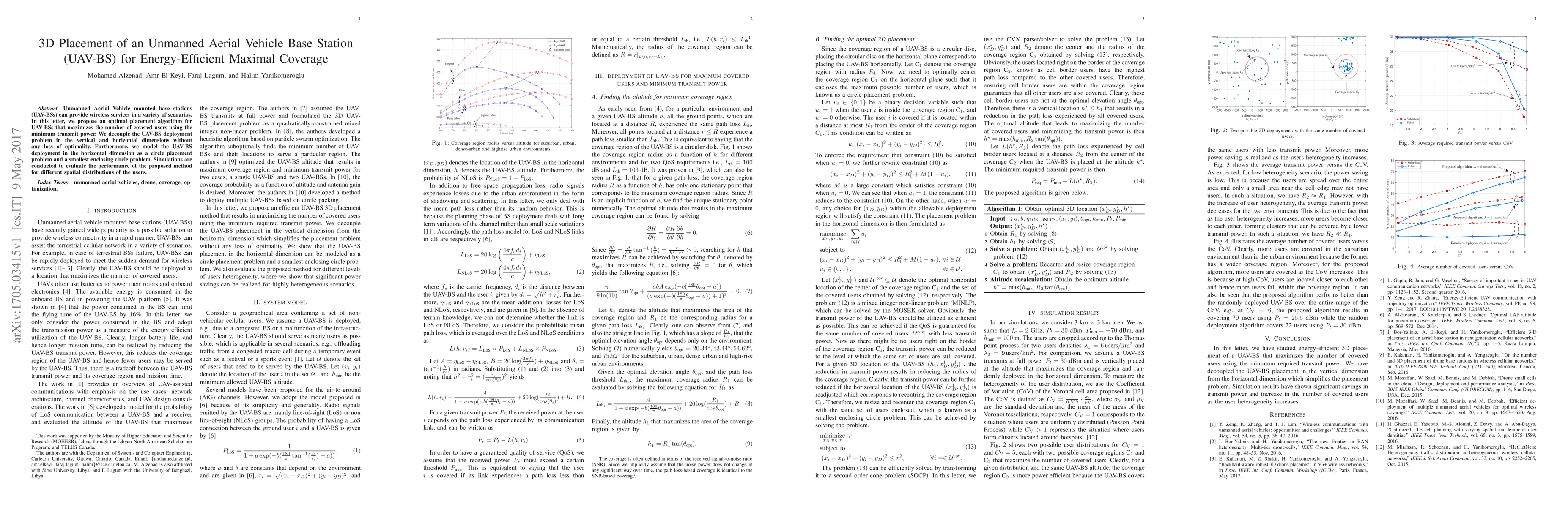 This paper proposes an optimal placement algorithm for Unmanned Aerial Vehicle base stations (UAV-BSs) to maximize coverage with minimal power, decoupling the problem into vertical and horizontal dimensions. Simulation results show the effectiveness of the method for various user distributions.