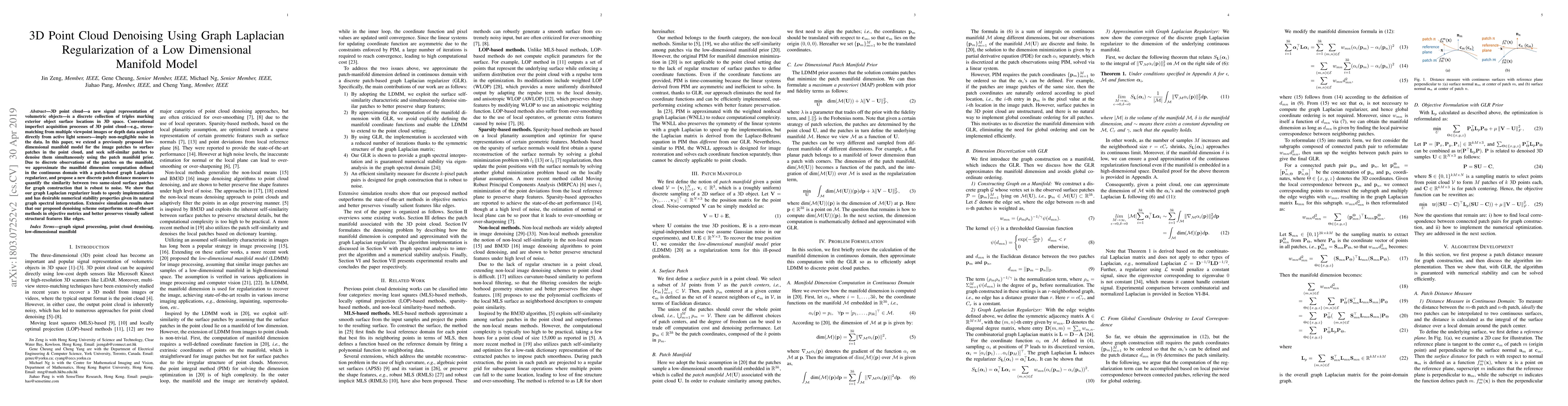 This paper proposes a method for denoising 3D point clouds using a low-dimensional manifold model and graph Laplacian regularization. The method leverages self-similar patches and a robust discrete patch distance measure to achieve effective denoising while preserving structural features.