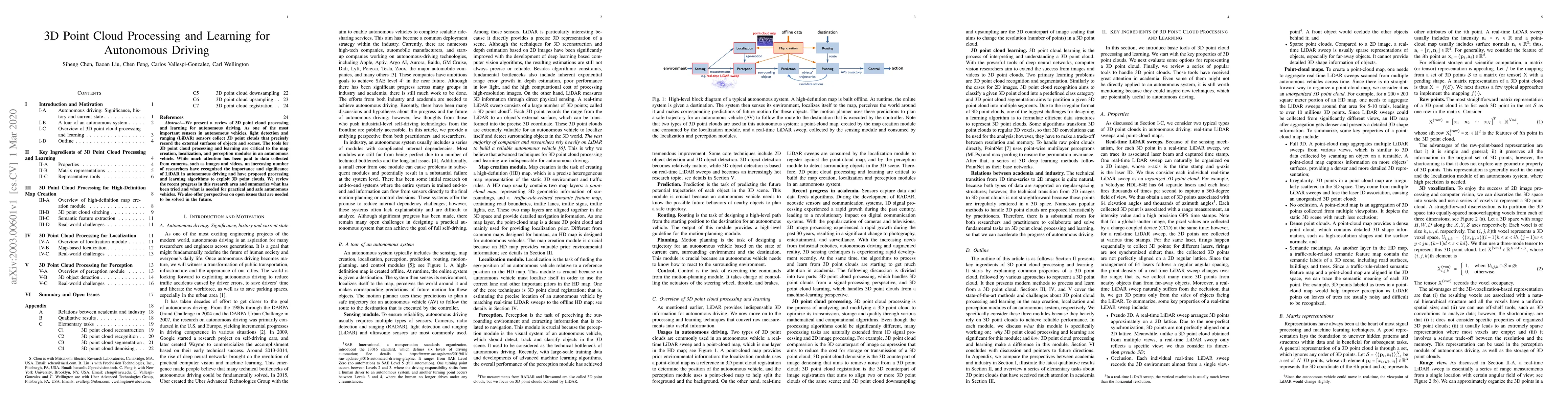 We present a review of 3D point cloud processing and learning for autonomous driving. As one of the most important sensors in autonomous vehicles, light detection and ranging (LiDAR) sensors collect 3D point clouds that precisely record the external surfaces of objects and scenes. The tools for 3D point cloud processing and learning are critical to the map creation, localization, and perception modules in an autonomous vehicle. While much attention has been paid to data collected from cameras, such as images and videos, an increasing number of researchers have recognized the importance and significance of LiDAR in autonomous driving and have proposed processing and learning algorithms to exploit 3D point clouds. We review the recent progress in this research area and summarize what has been tried and what is needed for practical and safe autonomous vehicles. We also offer perspectives on open issues that are needed to be solved in the future.