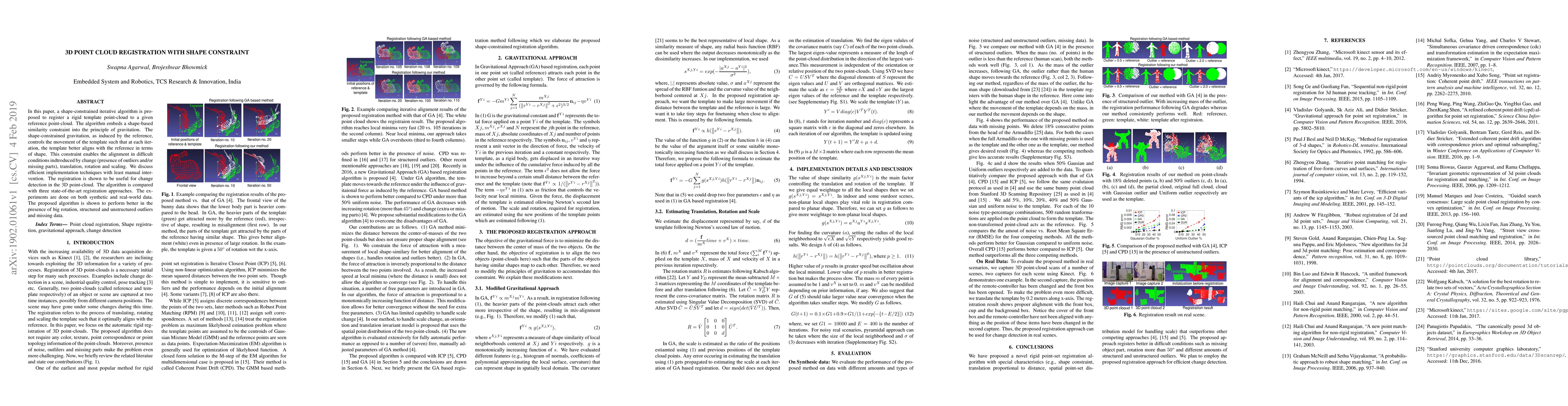 In this paper, a shape-constrained iterative algorithm is proposed to register a rigid template point-cloud to a given reference point-cloud. The algorithm embeds a shape-based similarity constraint into the principle of gravitation. The shape-constrained gravitation, as induced by the reference, controls the movement of the template such that at each iteration, the template better aligns with the reference in terms of shape. This constraint enables the alignment in difficult conditions indtroduced by change (presence of outliers and/or missing parts), translation, rotation and scaling. We discuss efficient implementation techniques with least manual intervention. The registration is shown to be useful for change detection in the 3D point-cloud. The algorithm is compared with three state-of-the-art registration approaches. The experiments are done on both synthetic and real-world data. The proposed algorithm is shown to perform better in the presence of big rotation, structured and unstructured outliers and missing data.