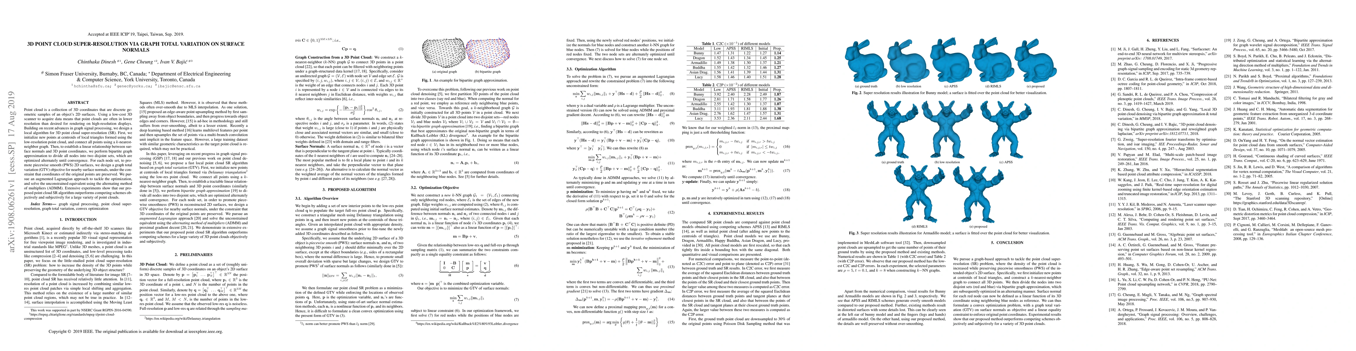 This paper proposes a local algorithm for 3D point cloud super-resolution using graph total variation on surface normals. It initializes new points at triangle centroids and optimizes surface normals via bipartite graph approximation and an augmented Lagrangian approach, achieving superior results compared to other methods.
