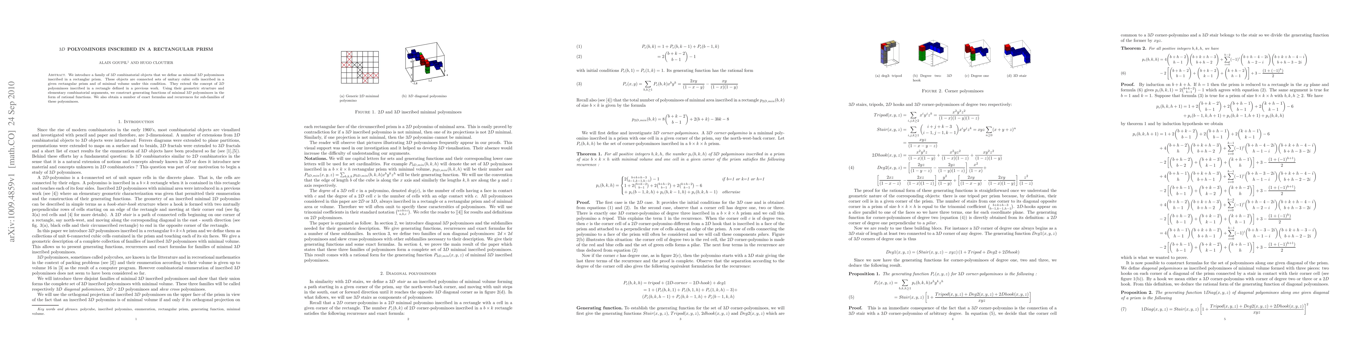 We introduce a family of 3D combinatorial objects that we define as minimal 3D polyominoes inscribed in a rectanglar prism. These objects are connected sets of unitary cubic cells inscribed in a given rectangular prism and of minimal volume under this condition. They extend the concept of 2D polyominoes inscribed in a rectangle defined in a previous work. Using their geometric structure and elementary combinatorial arguments, we construct generating functions of minimal 3D polyominoes in the form of rational functions. We also obtain a number of exact formulas and recurrences for sub-families of these polyominoes.