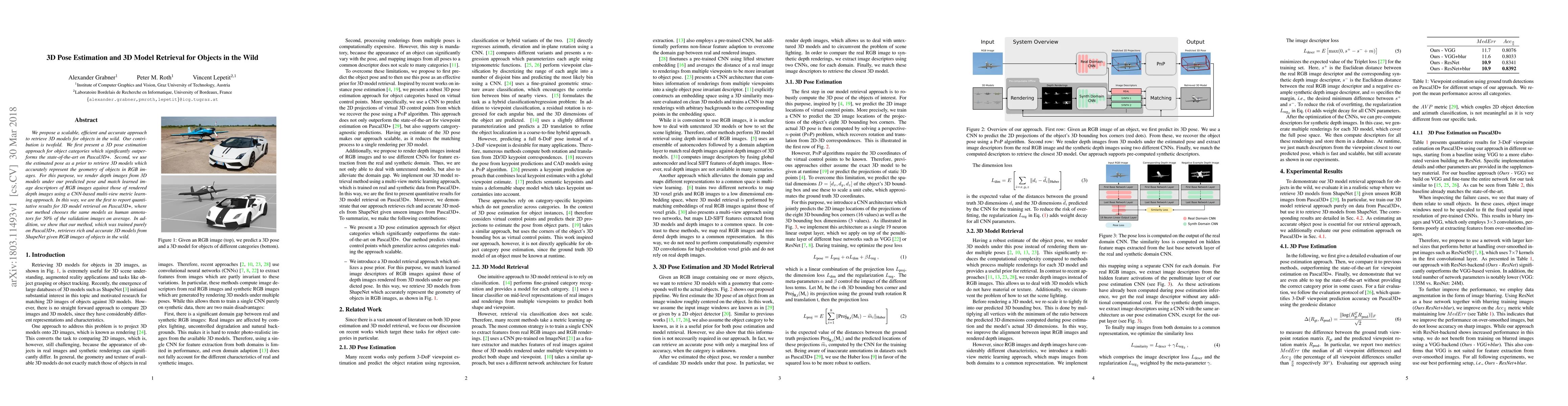 This paper proposes a method for 3D pose estimation and 3D model retrieval for objects in the wild, achieving state-of-the-art performance on Pascal3D+. It uses estimated poses to accurately retrieve 3D models by matching RGB image descriptors with rendered depth images from 3D models.