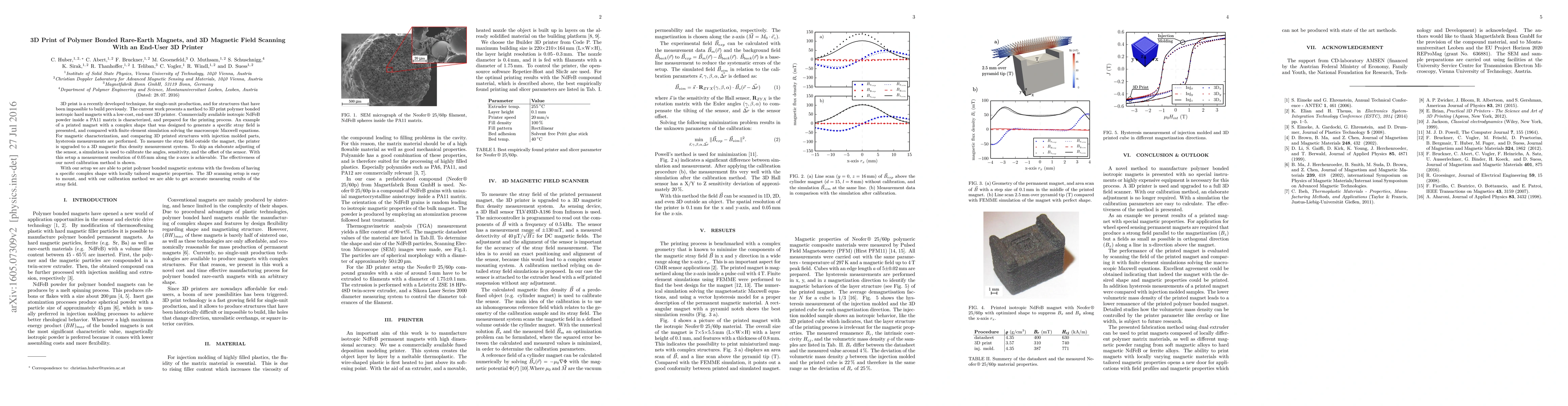 3D print is a recently developed technique, for single-unit production, and for structures that have been impossible to build previously. The current work presents a method to 3D print polymer bonded isotropic hard magnets with a low-cost, end-user 3D printer. Commercially available isotropic NdFeB powder inside a PA11 matrix is characterized, and prepared for the printing process. An example of a printed magnet with a complex shape that was designed to generate a specific stray field is presented, and compared with finite element simulation solving the macroscopic Maxwell equations. For magnetic characterization, and comparing 3D printed structures with injection molded parts, hysteresis measurements are performed. To measure the stray field outside the magnet, the printer is upgraded to a 3D magnetic flux density measurement system. To skip an elaborate adjusting of the sensor, a simulation is used to calibrate the angles, sensitivity, and the offset of the sensor. With this setup a measurement resolution of 0.05\,mm along the z-axes is achievable. The effectiveness of our novel calibration method is shown. With our setup we are able to print polymer bonded magnetic systems with the freedom of having a specific complex shape with locally tailored magnetic properties. The 3D scanning setup is easy to mount, and with our calibration method we are able to get accurate measuring results of the stray field.