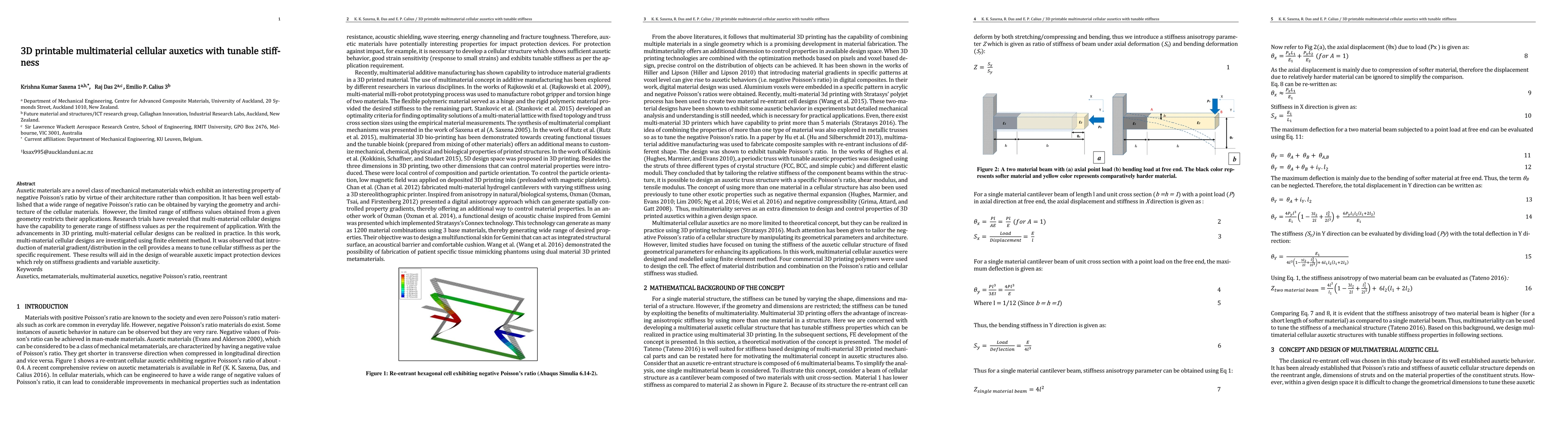 This paper explores 3D printable multimaterial cellular auxetics that allow tunable stiffness through material gradient distribution. Using finite element analysis, the study demonstrates that varying material composition within the cellular structure can achieve a wide range of stiffness values, enhancing the potential for applications in wearable impact protection devices.