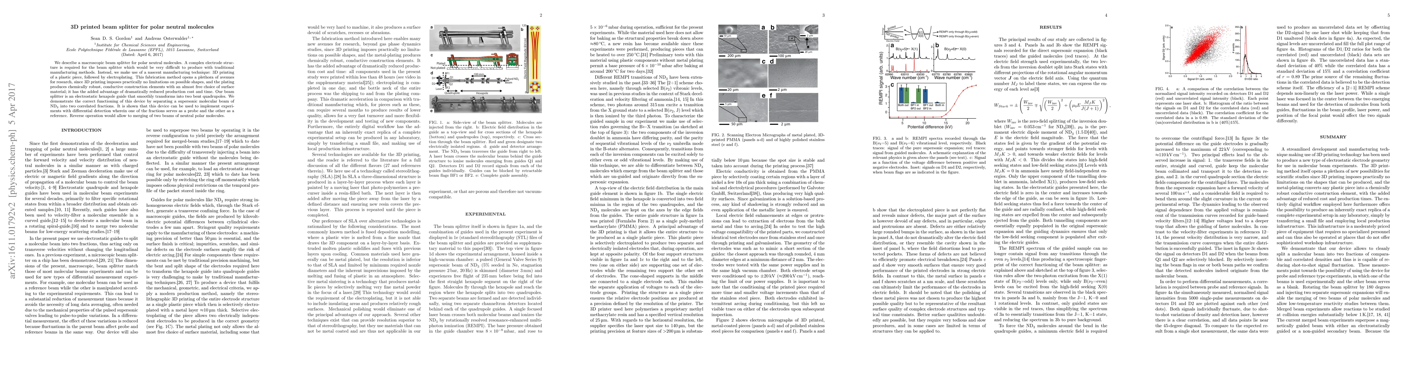 This paper presents a 3D printed beam splitter for polar neutral molecules, fabricated via plastic 3D printing followed by electroplating, enabling complex electrode structures. The device successfully separates a supersonic ND3 molecular beam, demonstrating potential for differential detection experiments.
