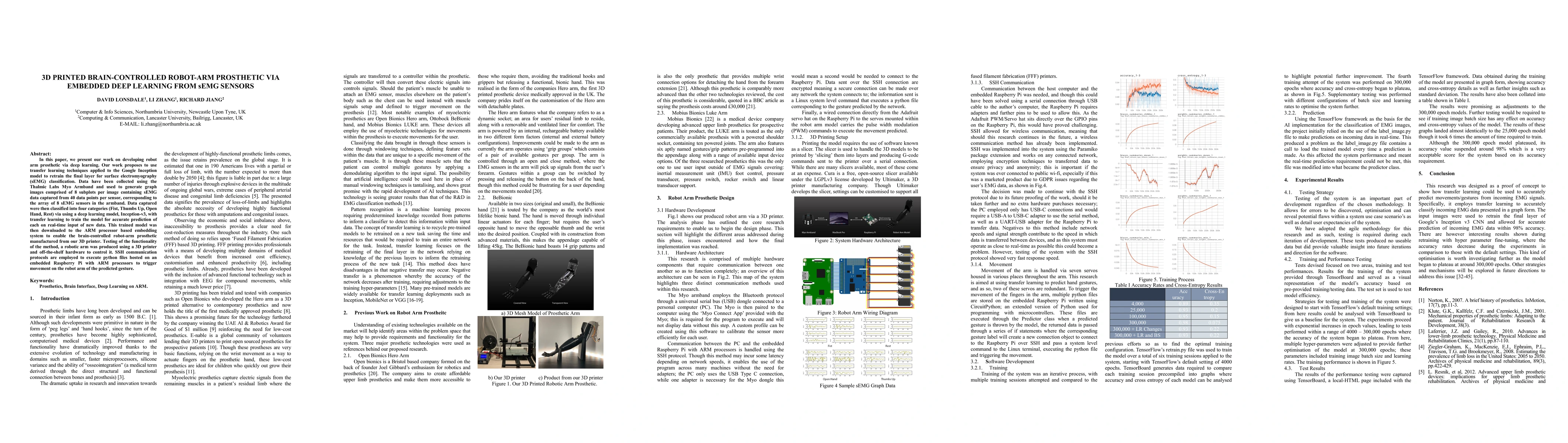 This paper develops a 3D printed brain-controlled robot-arm prosthetic using deep learning and sEMG sensors. The Google Inception model is retrained for real-time classification of four hand gestures, enabling control of a 3D printed robotic arm via SSH communication on an embedded Raspberry Pi.