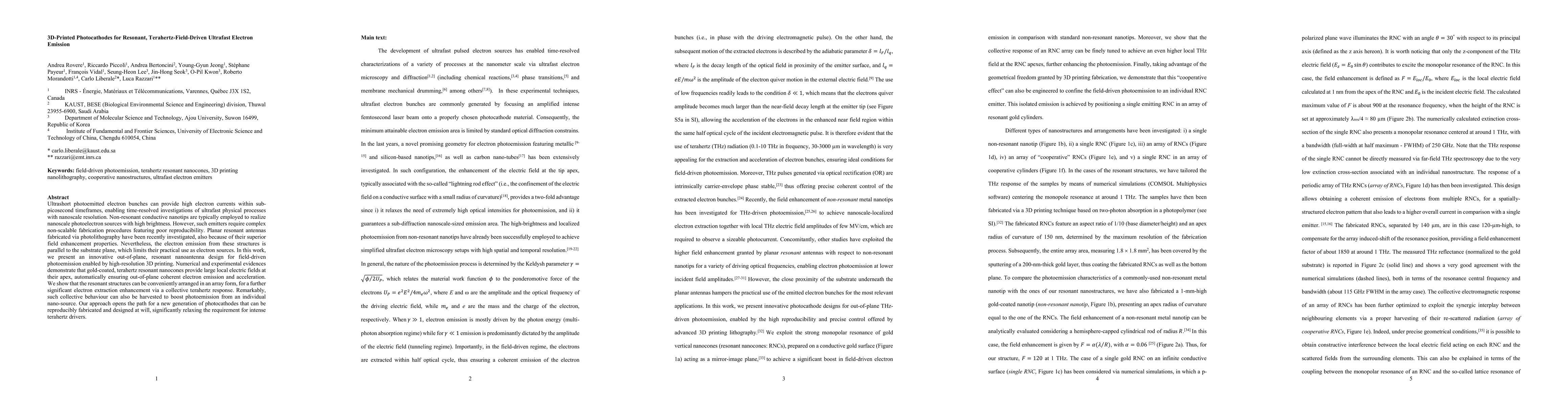 This paper presents a novel 3D-printed, resonant nanoantenna design for efficient terahertz-field-driven ultrafast electron emission, utilizing gold-coated terahertz resonant nanocones. The design enables out-of-plane, coherent electron emission and can be scaled into arrays for enhanced electron extraction, offering a reproducible and scalable solution for advanced photocathodes.