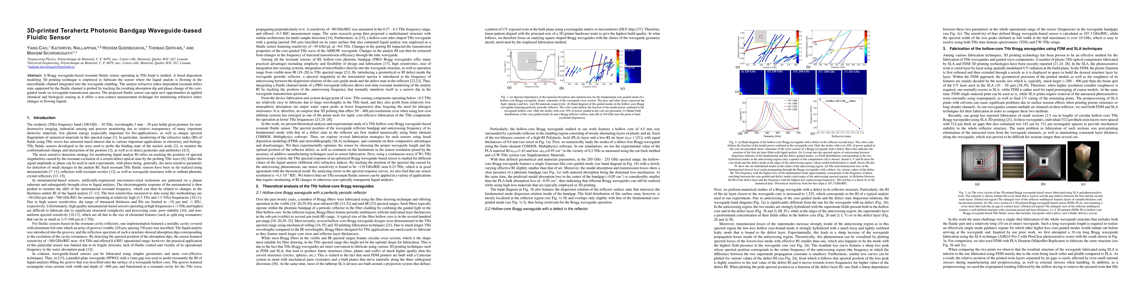 A Bragg waveguide-based resonant fluidic sensor operating in THz band is studied. A fused deposition modeling 3D printing technique is employed to fabricate the sensor where the liquid analyte is flowing in the microfluidic channel integrated into the waveguide cladding. The analyte refractive index-dependent resonant defect state supported by the fluidic channel is probed by tracking the resulting absorption dip and phase change of the core-guided mode on waveguide transmission spectra. The proposed fluidic sensor can open new opportunities in applied chemical and biological sensing as it offers a non-contact measurement technique for monitoring refractive index changes in flowing liquids.