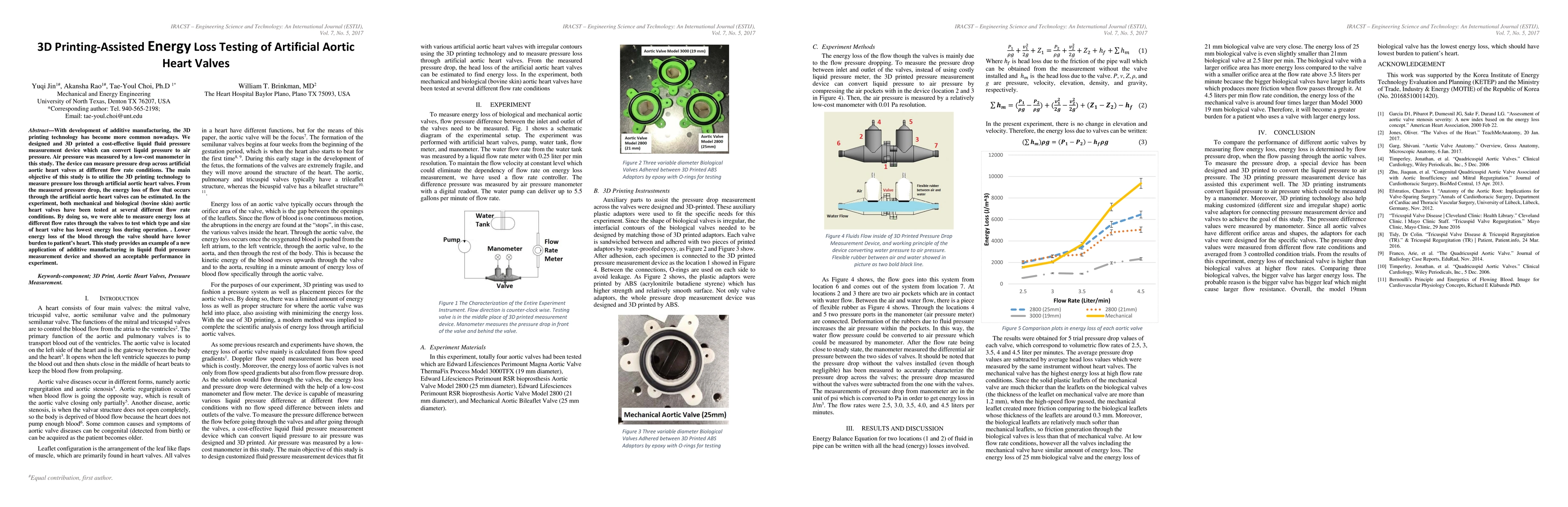 With the development of additive manufacturing, 3D printing technology has become more common nowadays. We designed and 3D printed a cost-effective liquid fluid pressure measurement device that can convert liquid pressure to air pressure. Air pressure was measured by a low-cost manometer in this study. The device can measure the pressure drop across artificial aortic heart valves at different flow rate conditions. The main objective of this study is to utilize 3D printing technology to measure pressure loss through artificial aortic heart valves. From the measured pressure drop, the energy loss of flow that occurs through the artificial aortic heart valves can be estimated. In the experiment, both mechanical and biological (bovine skin) aortic heart valves have been tested at several different flow rate conditions. By doing so, we were able to measure energy loss at different flow rates through the valves to test which type and size of the heart valve have the lowest energy loss during operation. Lower energy loss of the blood through the valve should have a lower burden to a patients heart. This study provides an example of a new application of additive manufacturing in liquid fluid pressure measurement devices and showed an acceptable performance in the experiment.