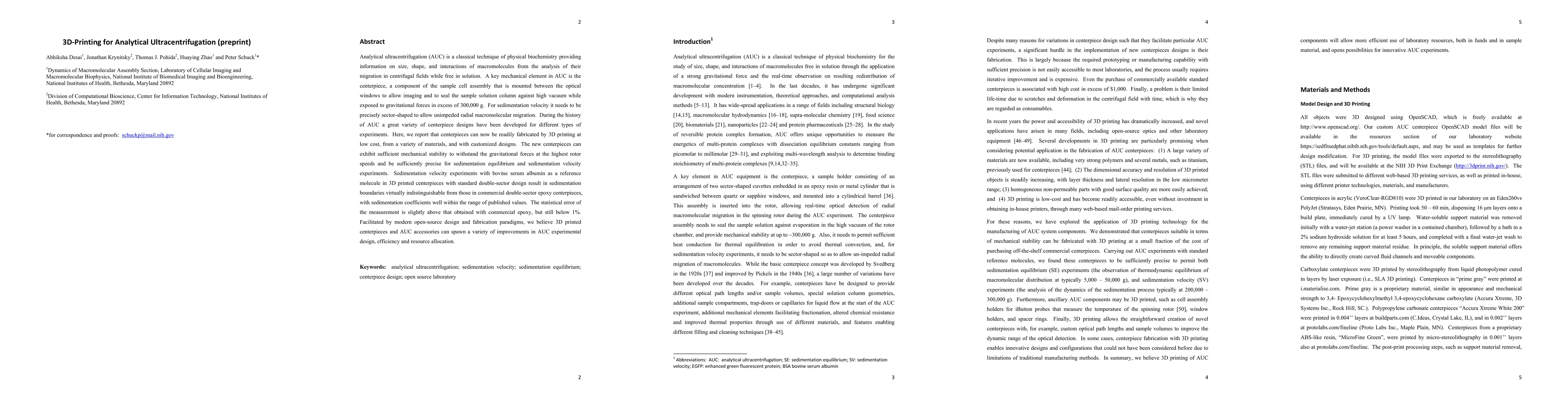 This research introduces 3D-printed centerpieces for Analytical Ultracentrifugation (AUC), a technique for studying macromolecules. These centerpieces, made from various materials, match commercial counterparts in precision and cost-effectiveness, potentially revolutionizing AUC experimental design and efficiency.