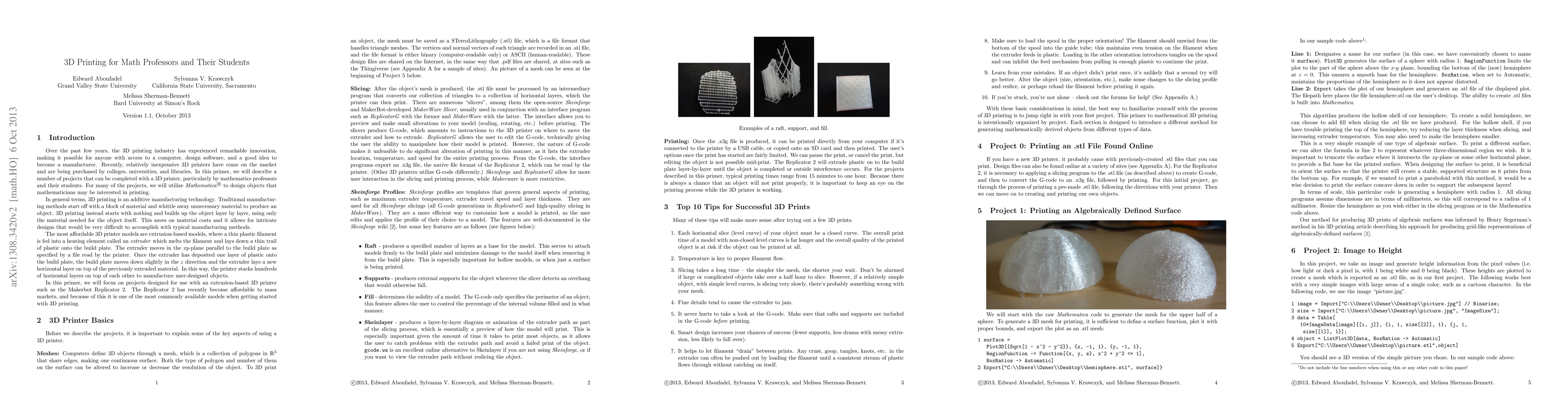 This paper explores various 3D printing projects suitable for math professors and students, utilizing Mathematica for design and incorporating data from an XBox Kinect, to enhance mathematical understanding through tangible models.