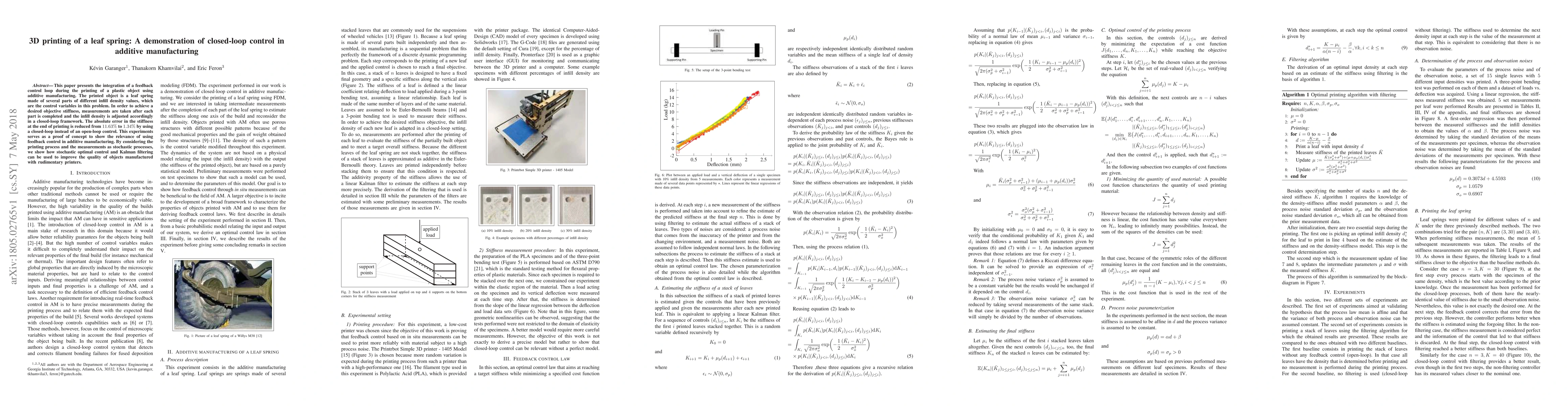 This paper presents the integration of a feedback control loop during the printing of a plastic object using additive manufacturing. The printed object is a leaf spring made of several parts of different infill density values, which are the control variables in this problem. In order to achieve a desired objective stiffness, measurements are taken after each part is completed and the infill density is adjusted accordingly in a closed-loop framework. The absolute error in the stiffness at the end of printing is reduced from 11.63% to 1.34% by using a closed-loop instead of an open-loop control. This experiments serves as a proof of concept to show the relevance of using feedback control in additive manufacturing. By considering the printing process and the measurements as stochastic processes, we show how stochastic optimal control and Kalman filtering can be used to improve the quality of objects manufactured with rudimentary printers.