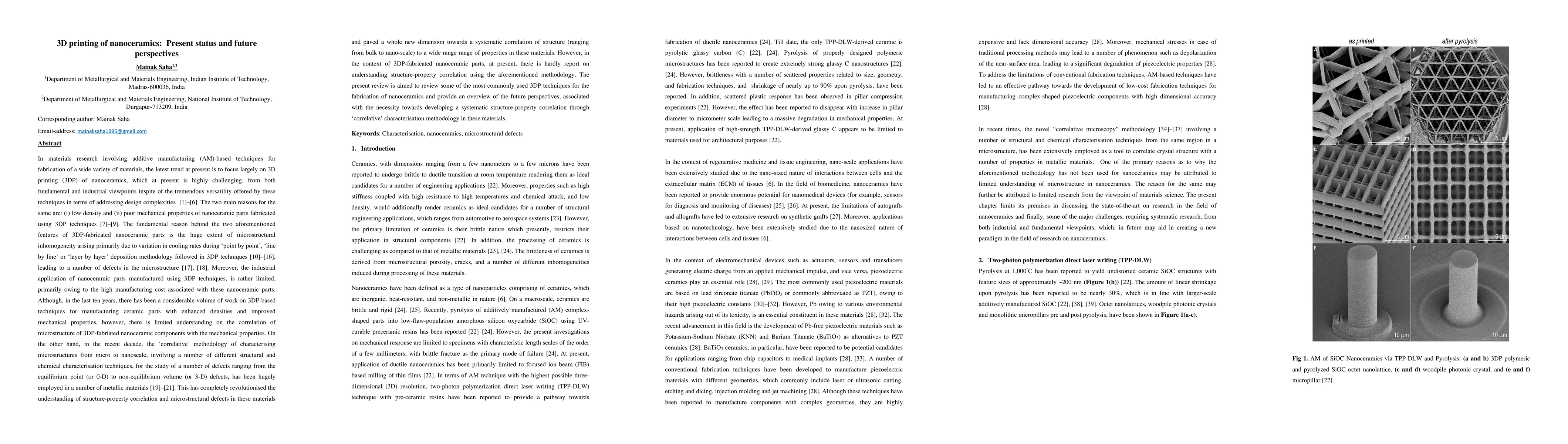 In materials research involving additive manufacturing (AM)-based techniques for fabrication of a wide variety of materials, the latest trend at present is to focus largely on 3D printing (3DP) of nanoceramics, which at present is highly challenging, from both fundamental and industrial viewpoints inspite of the tremendous versatility offered by these techniques in terms of addressing design complexities. The two main reasons for the same are: low density and poor mechanical properties of nanoceramic parts fabricated using 3DP techniques. The fundamental reason behind the two aforementioned features of 3DP-fabricated nanoceramic parts is the huge extent of microstructural inhomogeneity arising primarily due to variation in cooling rates during point by point, line by line or layer by layer deposition methodology followed in 3DP techniques, leading to a number of defects in the microstructure. Moreover, the industrial application of nanoceramic parts manufactured using 3DP techniques, is rather limited, primarily owing to the high manufacturing cost associated with these nanoceramic parts. Although, in the last ten years, there has been a considerable volume of work on 3DP-based techniques for manufacturing ceramic parts with enhanced densities and improved mechanical properties, however, there is limited understanding on the correlation of microstructure of 3DP-fabricated nanoceramic components with the mechanical properties. The present review is aimed to review some of the most commonly used 3DP techniques for the fabrication of nanoceramics and provide an overview of the future perspectives, associated with the necessity towards developing a systematic structure-property correlation through correlative characterisation methodology in these materials.