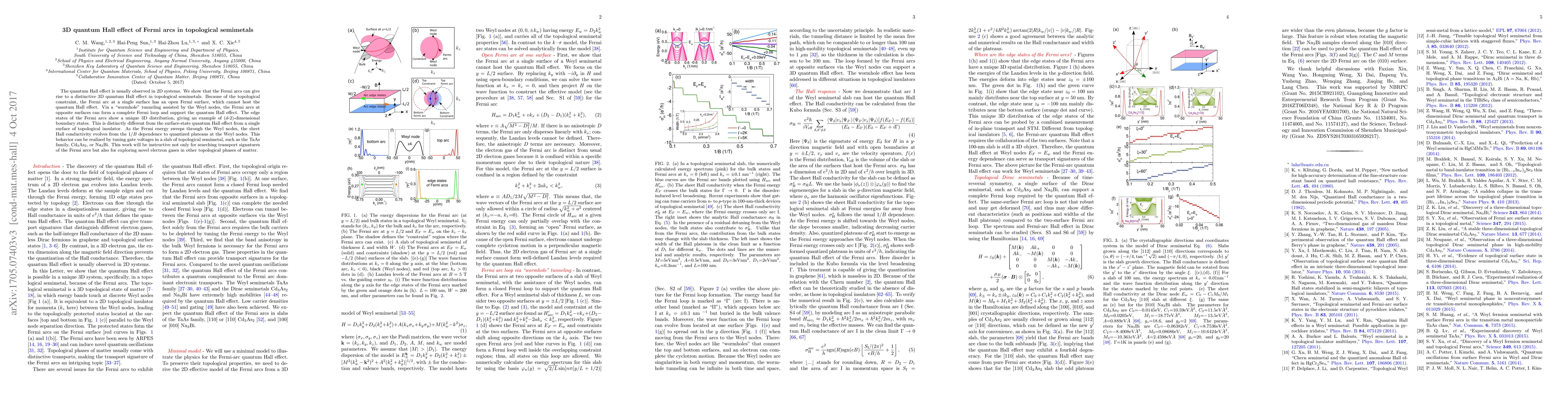 This paper demonstrates a 3D quantum Hall effect in topological semimetals arising from Fermi arcs, facilitated by tunneling through Weyl nodes. The unique 3D edge states exhibit quantized plateaus in sheet Hall conductivity, offering insights into novel electron gases in topological phases.