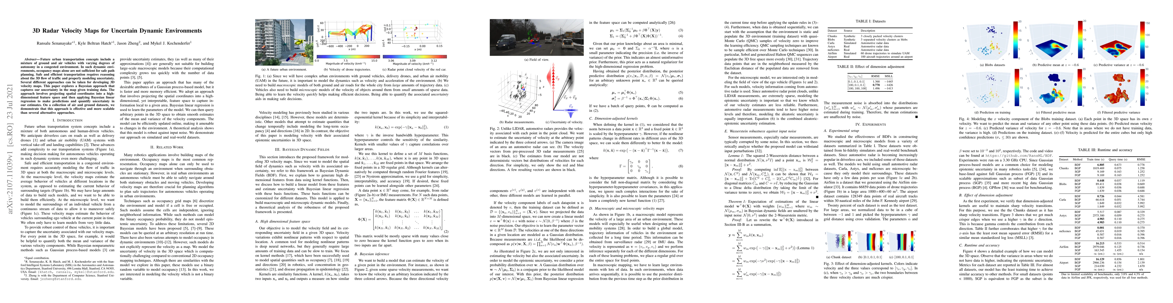 Future urban transportation concepts include a mixture of ground and air vehicles with varying degrees of autonomy in a congested environment. In such dynamic environments, occupancy maps alone are not sufficient for safe path planning. Safe and efficient transportation requires reasoning about the 3D flow of traffic and properly modeling uncertainty. Several different approaches can be taken for developing 3D velocity maps. This paper explores a Bayesian approach that captures our uncertainty in the map given training data. The approach involves projecting spatial coordinates into a high-dimensional feature space and then applying Bayesian linear regression to make predictions and quantify uncertainty in our estimates. On a collection of air and ground datasets, we demonstrate that this approach is effective and more scalable than several alternative approaches.