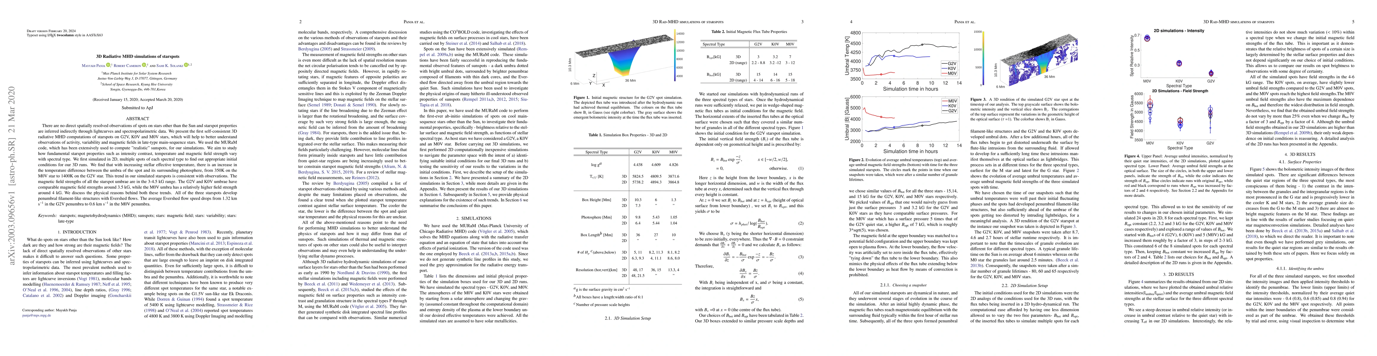 This paper presents the first 3D radiative MHD simulations of starspots on G2V, K0V, and M0V stars, revealing that higher effective temperature stars exhibit larger temperature differences between spots and surrounding photospheres, and magnetic field strengths range from 3-4.5 kG, with M0V stars having higher field strengths.