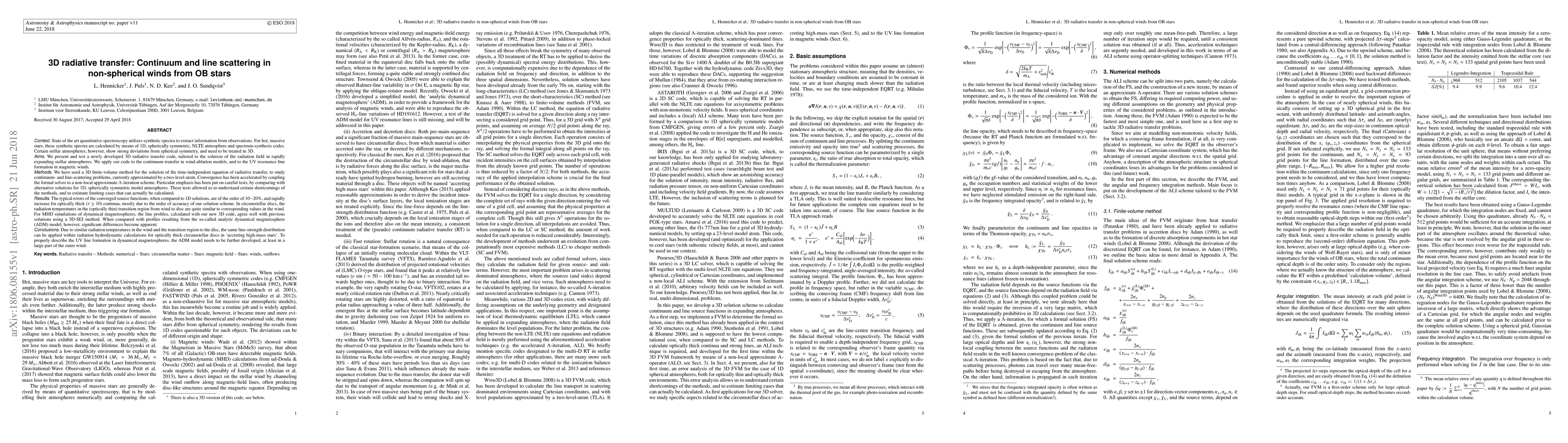 Context: State of the art quantitative spectroscopy of OB-stars compares synthetic spectra (calculated by means of 1D, spherically symmetric computer codes) with observations. Certain stellar atmospheres, however, show strong deviations from spherical symmetry, and need to be treated in 3D. Aims: We present a newly developed 3D radiative transfer code, tailored to the solution of the radiation field in rapidly expanding stellar atmospheres. We apply our code to the continuum transfer in wind-ablation models, and to the UV resonance line formation in magnetic winds. Methods: We have used a 3D finite-volume method for the solution of the equation of radiative transfer, to study continuum- and line-scattering problems. Convergence has been accelerated by a non-local approximate Lambda-iteration scheme. Particular emphasis has been put on careful (spherically symmetric) test cases. Results: Typical errors of the source functions, when compared to 1D solutions, are of the order of 10-20 %, and increase for optically thick continua. In circumstellar discs, the radiation temperatures in the (optically thin) transition region from wind to disc are quite similar to corresponding values in the wind. For MHD simulations of dynamical magnetospheres, the line profiles, calculated with our 3D code, agree well with previous solutions using a 3D-SEI method. When compared with profiles resulting from the `analytic dynamical magnetosphere' (ADM) model, significant differences become apparent. Conclusions: Due to similar radiation temperatures in the wind and the transition region to the disc, the same line-strength distribution can be applied within radiation hydrodynamic calculations for circumstellar discs in `accreting high-mass stars'. To properly describe the UV line formation in dynamical magnetospheres, the ADM model needs to be further developed, at least in a large part of the outer wind.