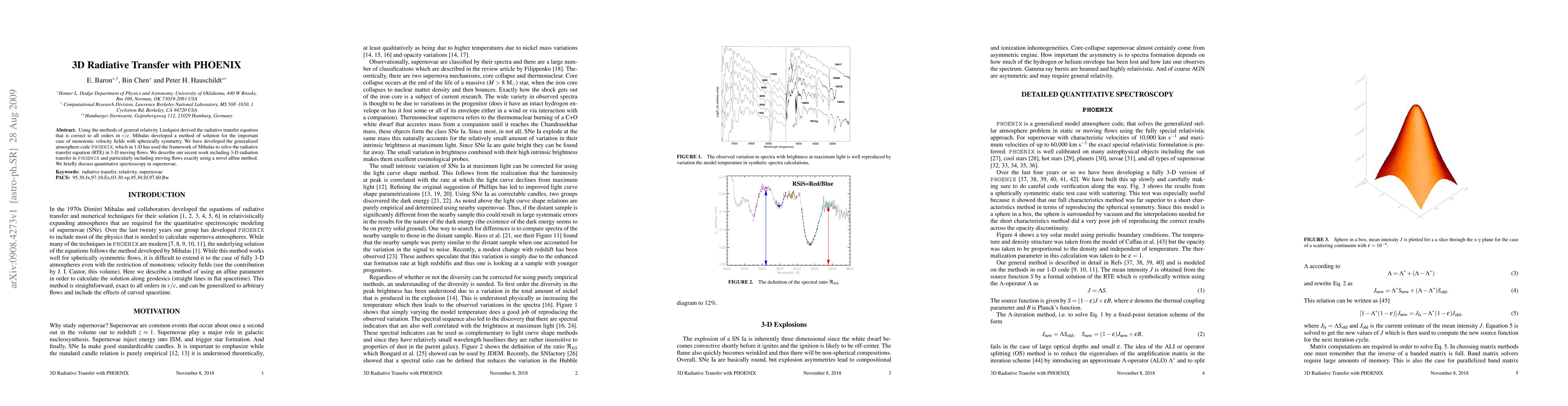 This paper presents the development of the PHOENIX code for solving the radiative transfer equation in 3D, extending previous 1D solutions to include moving flows with an innovative affine method. It also touches on applications in quantitative spectroscopy for supernovae.