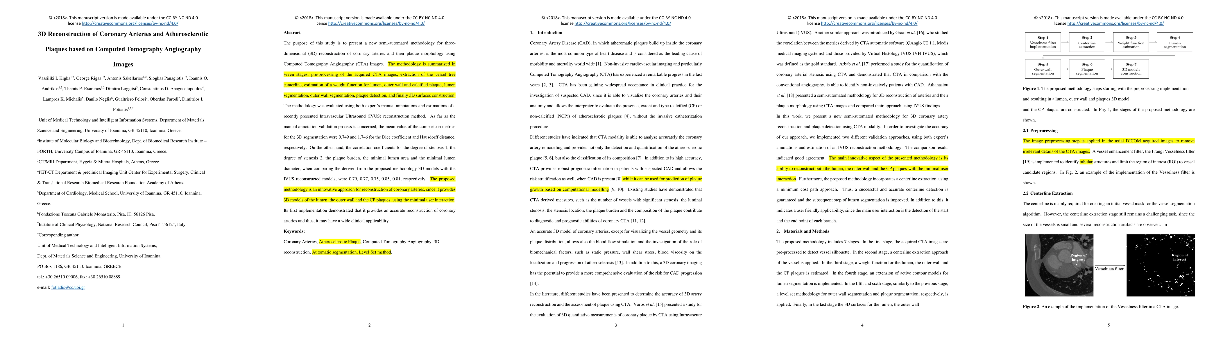 The paper presents a semi-automated methodology for 3D reconstruction of coronary arteries and atherosclerotic plaques using Computed Tomography Angiography (CTA) images, involving seven stages: pre-processing, vessel tree centerline extraction, weight function estimation, lumen segmentation, outer wall segmentation, plaque detection, and 3D surface construction.
