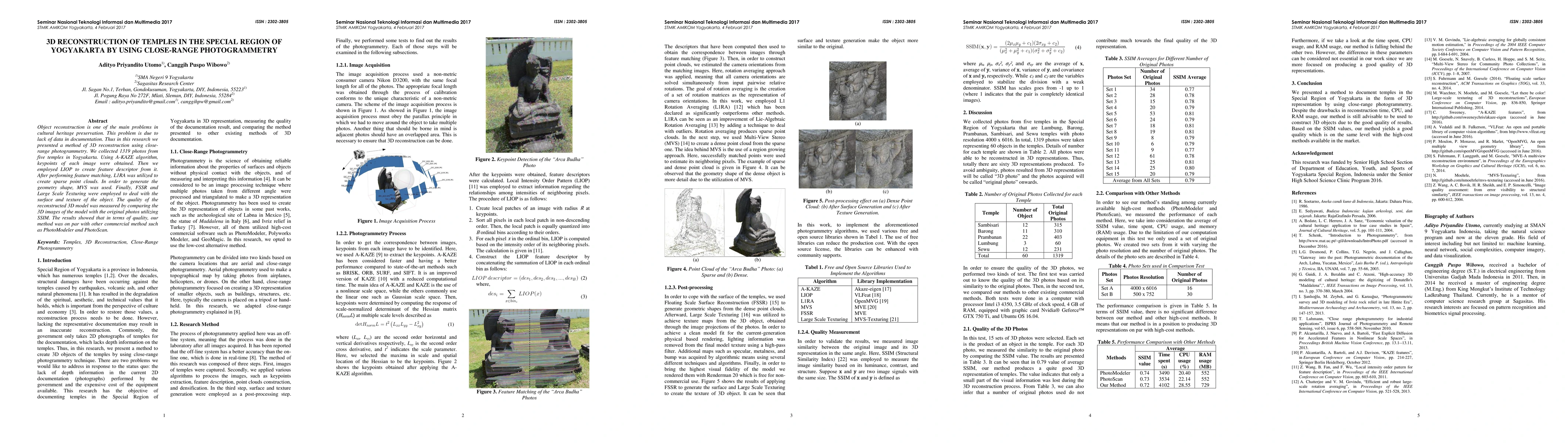 This paper presents a method for 3D reconstruction of temples in Yogyakarta using close-range photogrammetry, involving keypoint extraction, feature matching, and sparse point cloud creation. The quality of the 3D models was comparable to commercial software like PhotoModeler and PhotoScan.