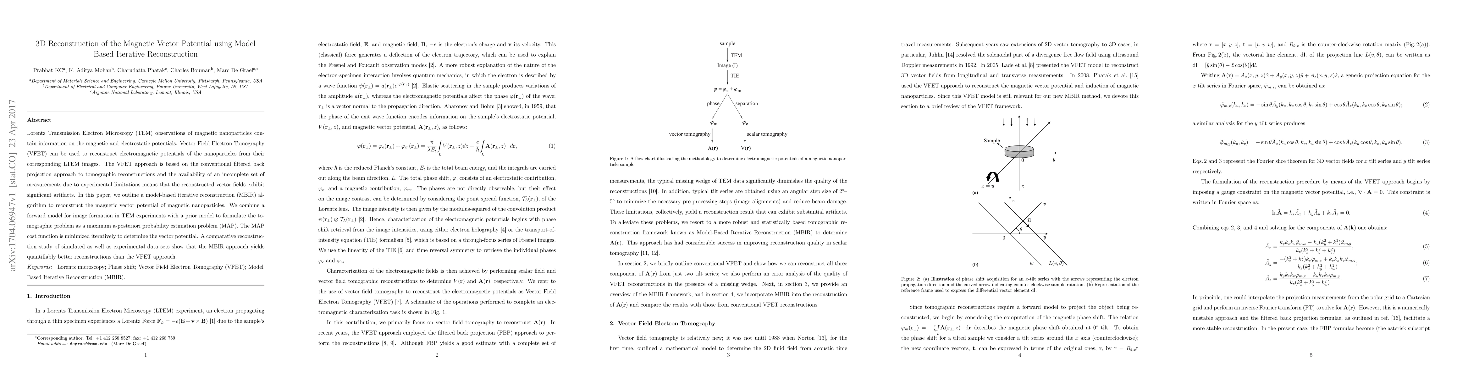 This paper proposes a model-based iterative reconstruction (MBIR) algorithm to improve the 3D reconstruction of magnetic vector potentials from Lorentz Transmission Electron Microscopy (LTEM) images. The MBIR approach combines a forward model with a prior model to minimize the MAP cost function, yielding better reconstructions compared to the conventional vector field electron tomography (VFET) method.