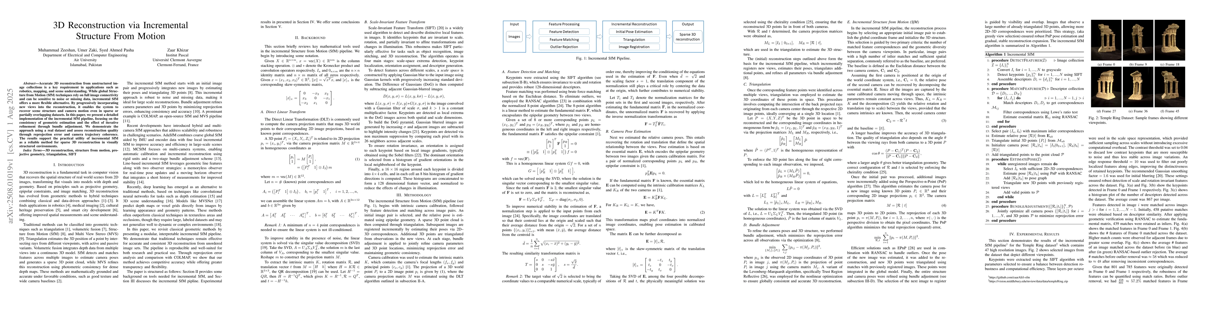 Accurate 3D reconstruction from unstructured image collections is a key requirement in applications such as robotics, mapping, and scene understanding. While global Structure from Motion (SfM) techniques rely on full image connectivity and can be sensitive to noise or missing data, incremental SfM offers a more flexible alternative. By progressively incorporating new views into the reconstruction, it enables the system to recover scene structure and camera motion even in sparse or partially overlapping datasets. In this paper, we present a detailed implementation of the incremental SfM pipeline, focusing on the consistency of geometric estimation and the effect of iterative refinement through bundle adjustment. We demonstrate the approach using a real dataset and assess reconstruction quality through reprojection error and camera trajectory coherence. The results support the practical utility of incremental SfM as a reliable method for sparse 3D reconstruction in visually structured environments.