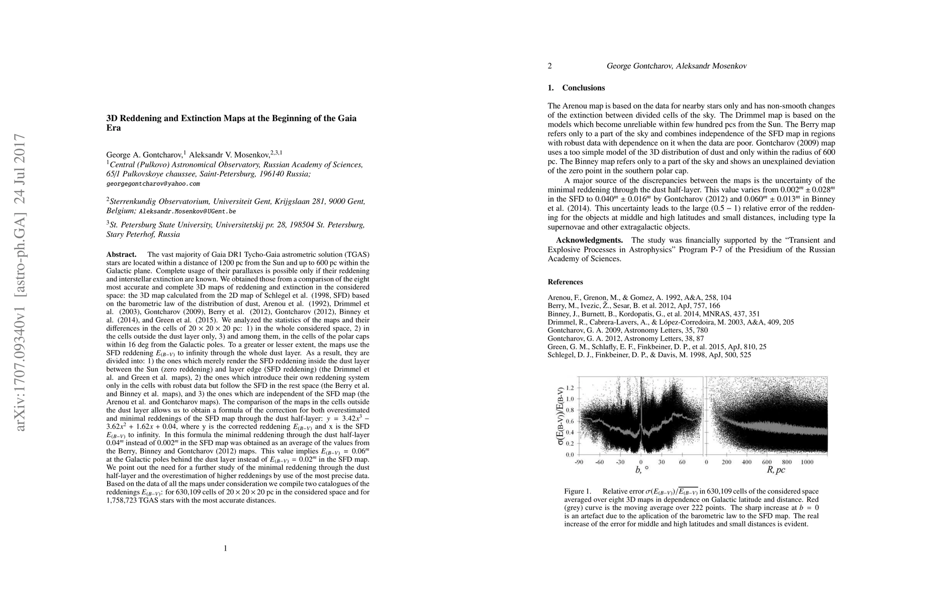 This paper compiles 3D reddening and extinction maps for stars within 1200 pc from the Sun, using Gaia DR1 TGAS data. It compares eight existing maps to derive correction formulas for reddening discrepancies and highlights the need for further study on minimal reddening through dust layers. Two catalogues are produced, detailing reddening for 630,109 cells and 1,758,723 TGAS stars.