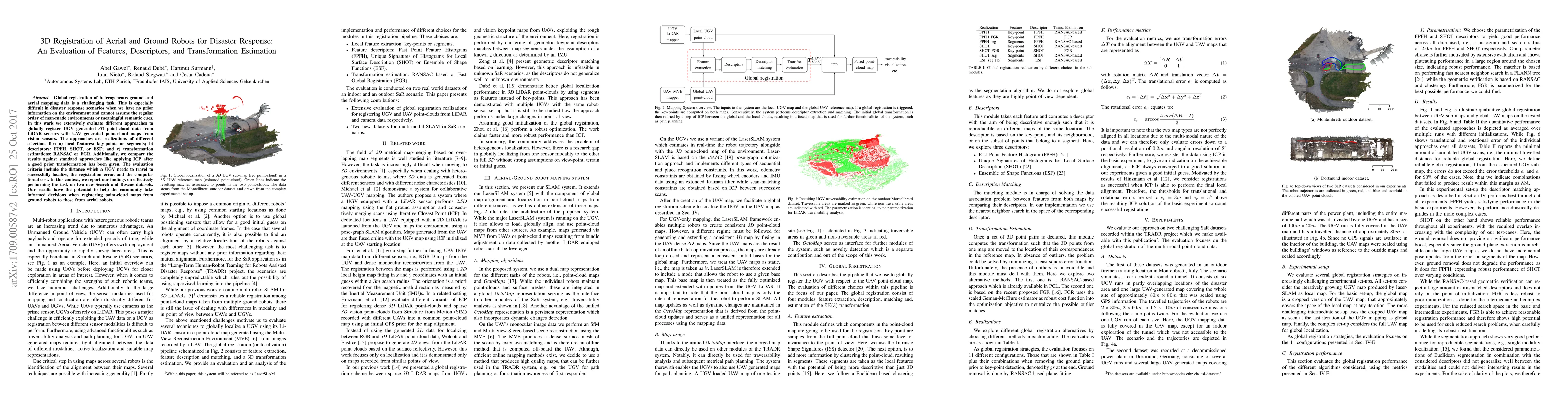Global registration of heterogeneous ground and aerial mapping data is a challenging task. This is especially difficult in disaster response scenarios when we have no prior information on the environment and cannot assume the regular order of man-made environments or meaningful semantic cues. In this work we extensively evaluate different approaches to globally register UGV generated 3D point-cloud data from LiDAR sensors with UAV generated point-cloud maps from vision sensors. The approaches are realizations of different selections for: a) local features: key-points or segments; b) descriptors: FPFH, SHOT, or ESF; and c) transformation estimations: RANSAC or FGR. Additionally, we compare the results against standard approaches like applying ICP after a good prior transformation has been given. The evaluation criteria include the distance which a UGV needs to travel to successfully localize, the registration error, and the computational cost. In this context, we report our findings on effectively performing the task on two new Search and Rescue datasets. Our results have the potential to help the community take informed decisions when registering point-cloud maps from ground robots to those from aerial robots.