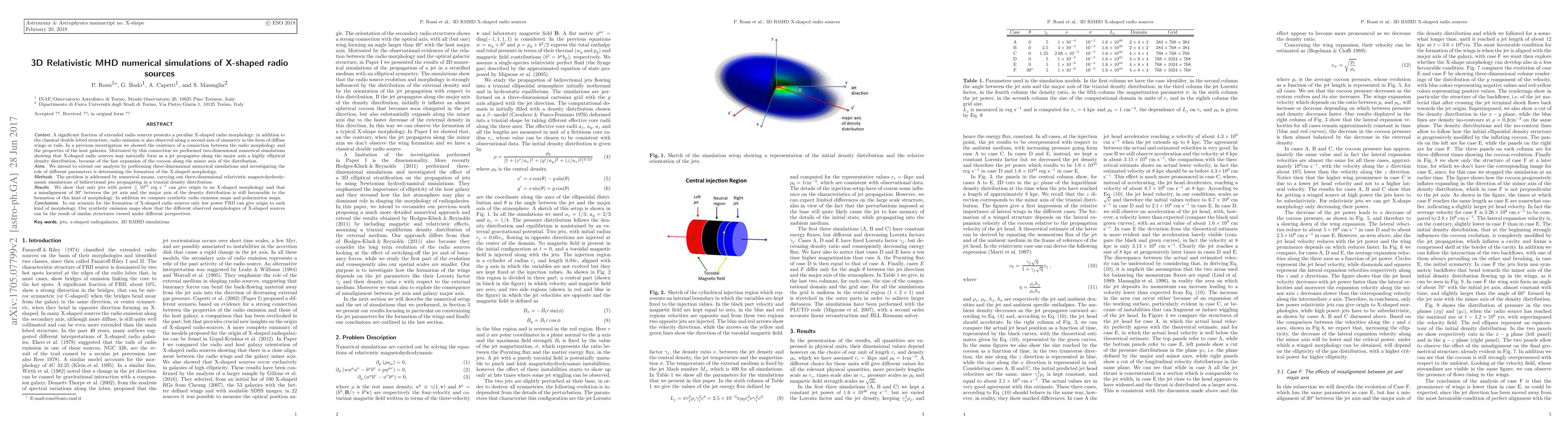A significant fraction of extended radio sources presents a peculiar X-shaped radio morphology: in addition to the classical double lobed structure, radio emission is also observed along a second axis of simmetry in the form of diffuse wings or tails. In a previous investigation we showed the existence of a connection between the radio morphology and the properties of the host galaxies. Motivated by this connection we performed two-dimensional numerical simulations showing that X-shaped radio sources may naturally form as a jet propagates along the major axis a highly elliptical density distribution, because of the fast expansion of the cocoon along the minor axis of the distribution. We intend to extend our analysis by performing three-dimensional numerical simulations and investigating the role of different parameters is determining the formation of the X-shaped morphology. The problem is addressed by numerical means, carrying out three-dimensional relativistic magnetohydrodynamic simulations of bidirectional jets propagating in a triaxial density distribution. We show that only jets with power $\lesssim 10^{44}$ erg s$^{-1}$ can give origin to an X-shaped morphology and that a misalignment of $30^o$ between the jet axis and the major axis of the density distribution is still favourable to the formation of this kind of morphology. In addition we compute synthetic radio emission maps and polarization maps. In our scenario for the formation of X-shaped radio sources only low power FRII can give origin to such kind of morphology. Our synthetic emission maps show that the different observed morphologies of X-shaped sources can be the result of similar structures viewed under different perspectives.
