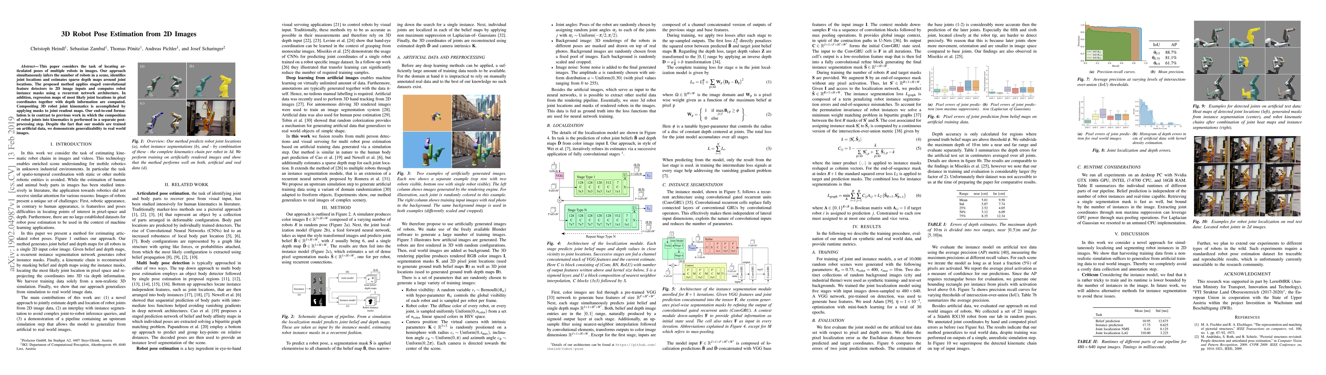 This paper considers the task of locating articulated poses of multiple robots in images. Our approach simultaneously infers the number of robots in a scene, identifies joint locations and estimates sparse depth maps around joint locations. The proposed method applies staged convolutional feature detectors to 2D image inputs and computes robot instance masks using a recurrent network architecture. In addition, regression maps of most likely joint locations in pixel coordinates together with depth information are computed. Compositing 3D robot joint kinematics is accomplished by applying masks to joint readout maps. Our end-to-end formulation is in contrast to previous work in which the composition of robot joints into kinematics is performed in a separate post-processing step. Despite the fact that our models are trained on artificial data, we demonstrate generalizability to real world images.
