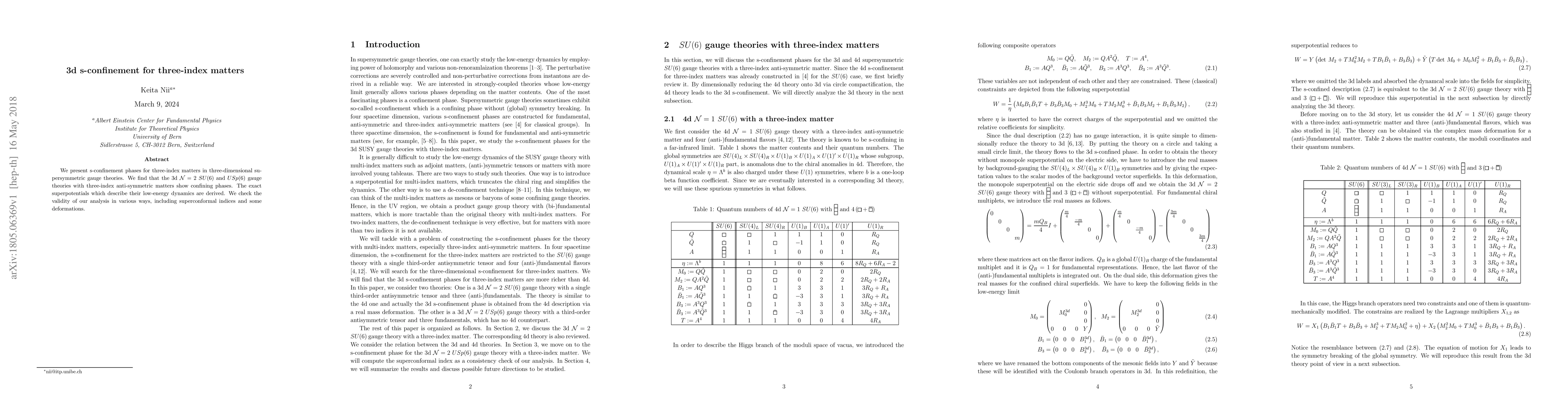 We present s-confinement phases for three-index matters in three-dimensional supersymmetric gauge theories. We find that the 3d $\mathcal{N}=2$ $SU(6)$ and $USp(6)$ gauge theories with three-index anti-symmetric matters show confining phases. The exact superpotentials which describe their low-energy dynamics are derived. We check the validity of our analysis in various ways, including superconformal indices and some deformations.