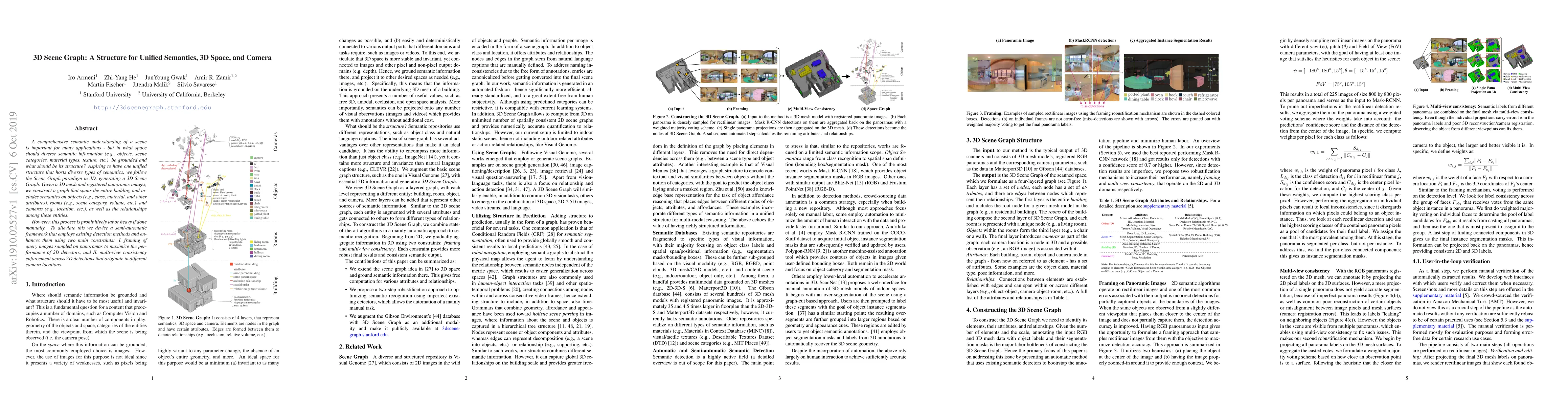 A comprehensive semantic understanding of a scene is important for many applications - but in what space should diverse semantic information (e.g., objects, scene categories, material types, texture, etc.) be grounded and what should be its structure? Aspiring to have one unified structure that hosts diverse types of semantics, we follow the Scene Graph paradigm in 3D, generating a 3D Scene Graph. Given a 3D mesh and registered panoramic images, we construct a graph that spans the entire building and includes semantics on objects (e.g., class, material, and other attributes), rooms (e.g., scene category, volume, etc.) and cameras (e.g., location, etc.), as well as the relationships among these entities. However, this process is prohibitively labor heavy if done manually. To alleviate this we devise a semi-automatic framework that employs existing detection methods and enhances them using two main constraints: I. framing of query images sampled on panoramas to maximize the performance of 2D detectors, and II. multi-view consistency enforcement across 2D detections that originate in different camera locations.
