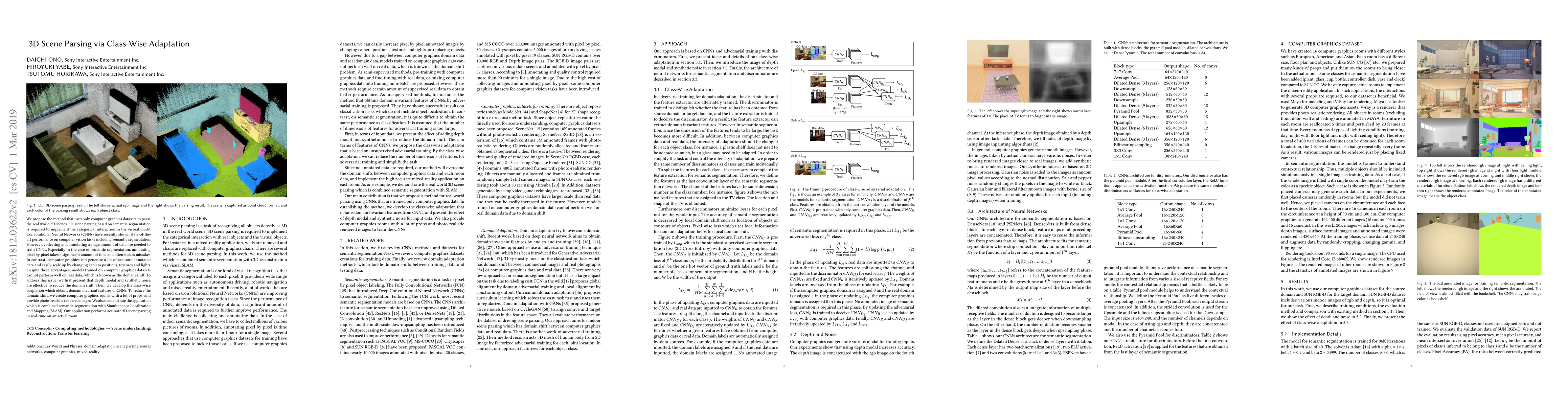 We propose the method that uses only computer graphics datasets to parse the real world 3D scenes. 3D scene parsing based on semantic segmentation is required to implement the categorical interaction in the virtual world. Convolutional Neural Networks (CNNs) have recently shown state-of-theart performance on computer vision tasks including semantic segmentation. However, collecting and annotating a huge amount of data are needed to train CNNs. Especially in the case of semantic segmentation, annotating pixel by pixel takes a significant amount of time and often makes mistakes. In contrast, computer graphics can generate a lot of accurate annotated data and easily scale up by changing camera positions, textures and lights. Despite these advantages, models trained on computer graphics datasets cannot perform well on real data, which is known as the domain shift. To address this issue, we first present that depth modal and synthetic noise are effective to reduce the domain shift. Then, we develop the class-wise adaptation which obtains domain invariant features of CNNs. To reduce the domain shift, we create computer graphics rooms with a lot of props, and provide photo-realistic rendered images.We also demonstrate the application which is combined semantic segmentation with Simultaneous Localization and Mapping (SLAM). Our application performs accurate 3D scene parsing in real-time on an actual room.