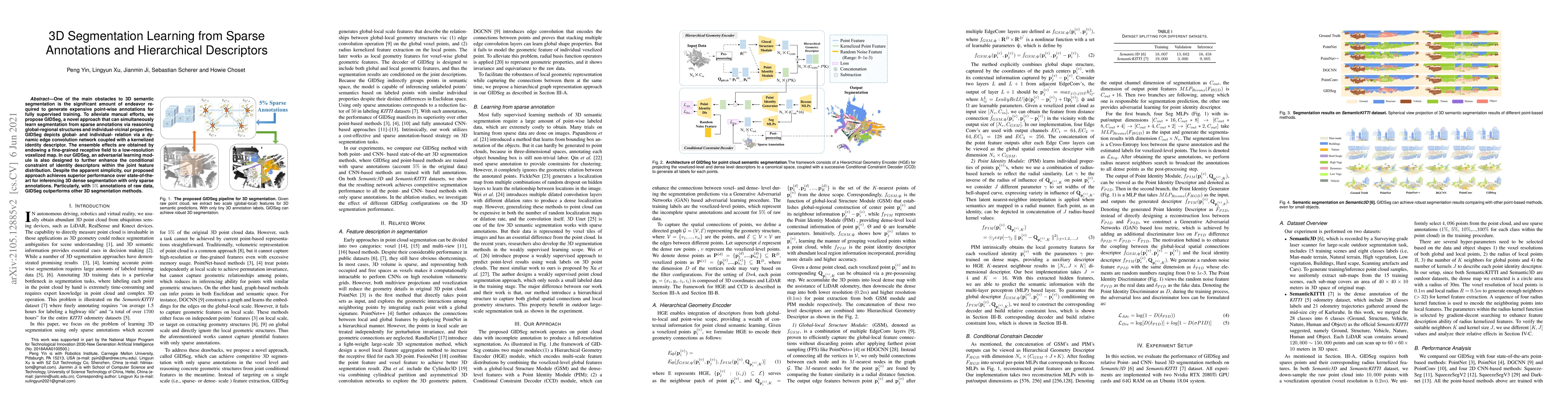 The paper introduces GIDSeg, a novel method for 3D semantic segmentation that learns from sparse annotations by leveraging global-regional structures and hierarchical descriptors. GIDSeg achieves superior performance with minimal annotations, outperforming state-of-the-art methods even with only 5% of raw data annotations.