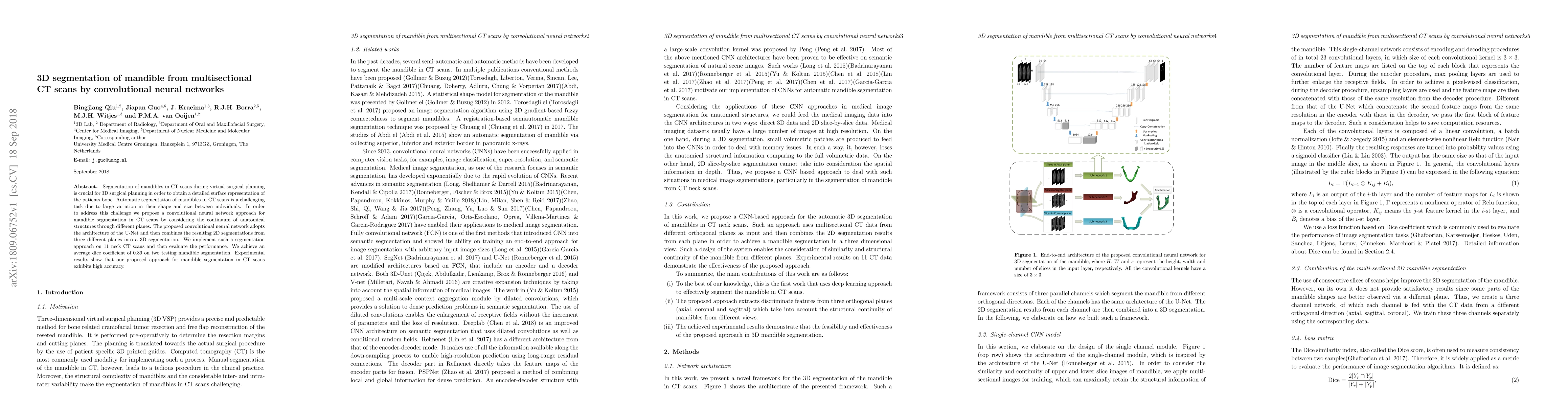 This paper proposes a convolutional neural network (CNN) approach using a U-Net architecture for 3D segmentation of mandibles from multisectional CT scans. The method combines 2D segmentations from three planes to achieve a 3D representation, achieving an average Dice coefficient of 0.89 on test data, demonstrating high accuracy in automatic mandible segmentation.