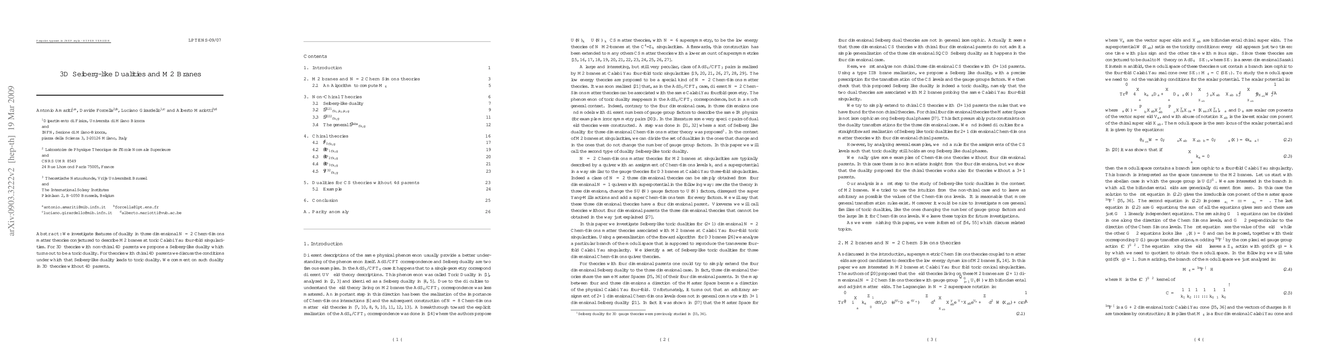 We investigate features of duality in three dimensional N=2 Chern-Simons matter theories conjectured to describe M2 branes at toric Calabi Yau four-fold singularities. For 3D theories with non-chiral 4D parents we propone a Seiberg-like duality which turns out to be a toric duality. For theories with chiral 4D parents we discuss the conditions under which that Seiberg-like duality leads to toric duality. We comment on such duality in 3D theories without 4D parents.
